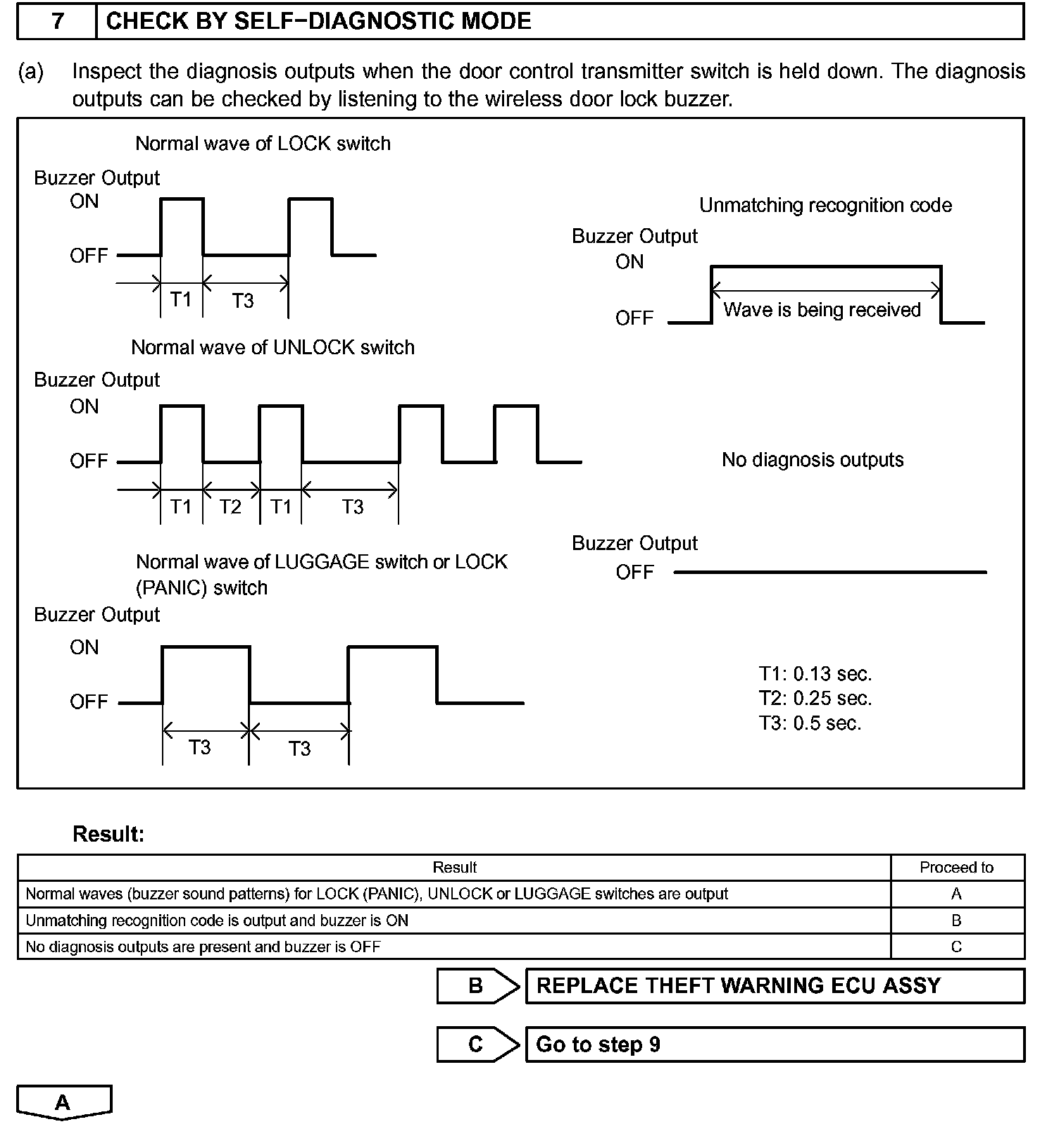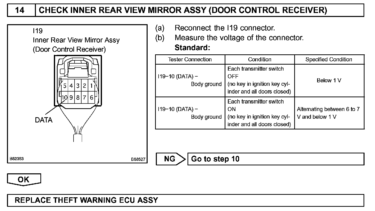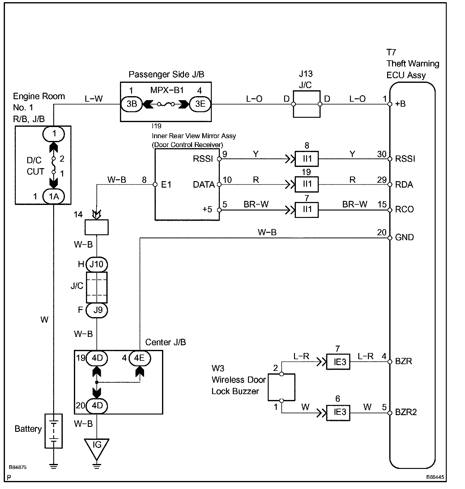 The signal from the transmitter is input to the theft warning ECU through the RDA line. The status of the RDA and RSSI lines are diagnosed by the theft warning ECU. If the wireless door lock control system fails, check for DTCs to confirm if the cause is the RDA and/or RSSI line.
