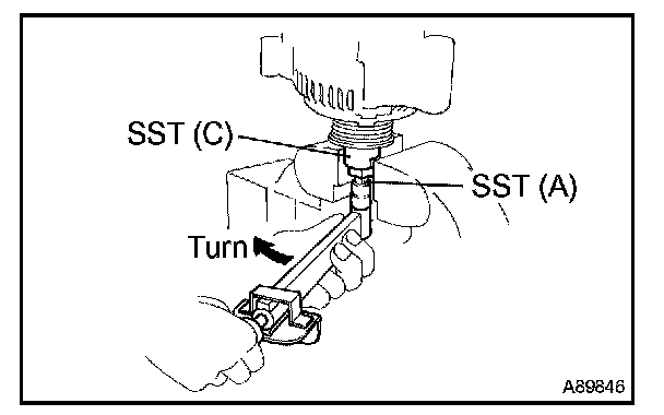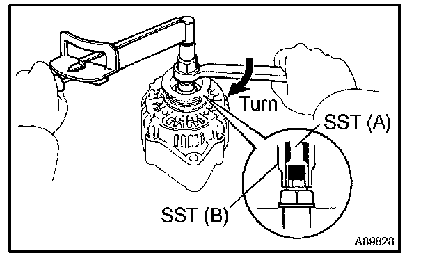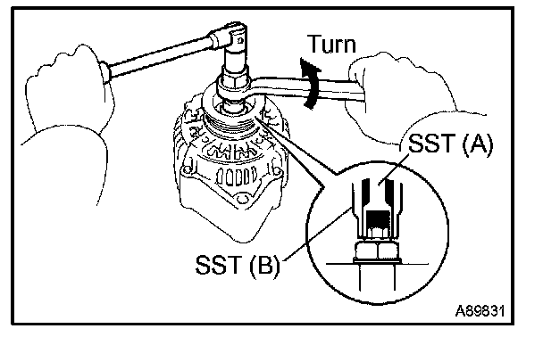 b. Hold SST (A) with a torque wrench, and tighten SST (B)clockwise to the specified torque.
