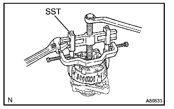 e. To loosen the pulley nut, turn SST (A) in the direction shown in the illustration.