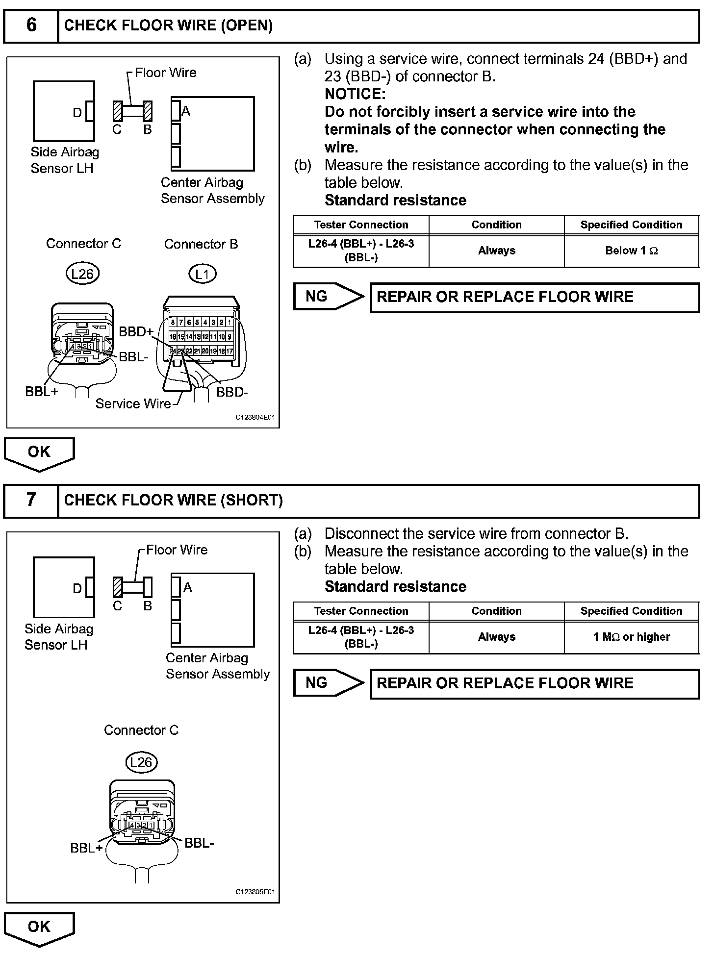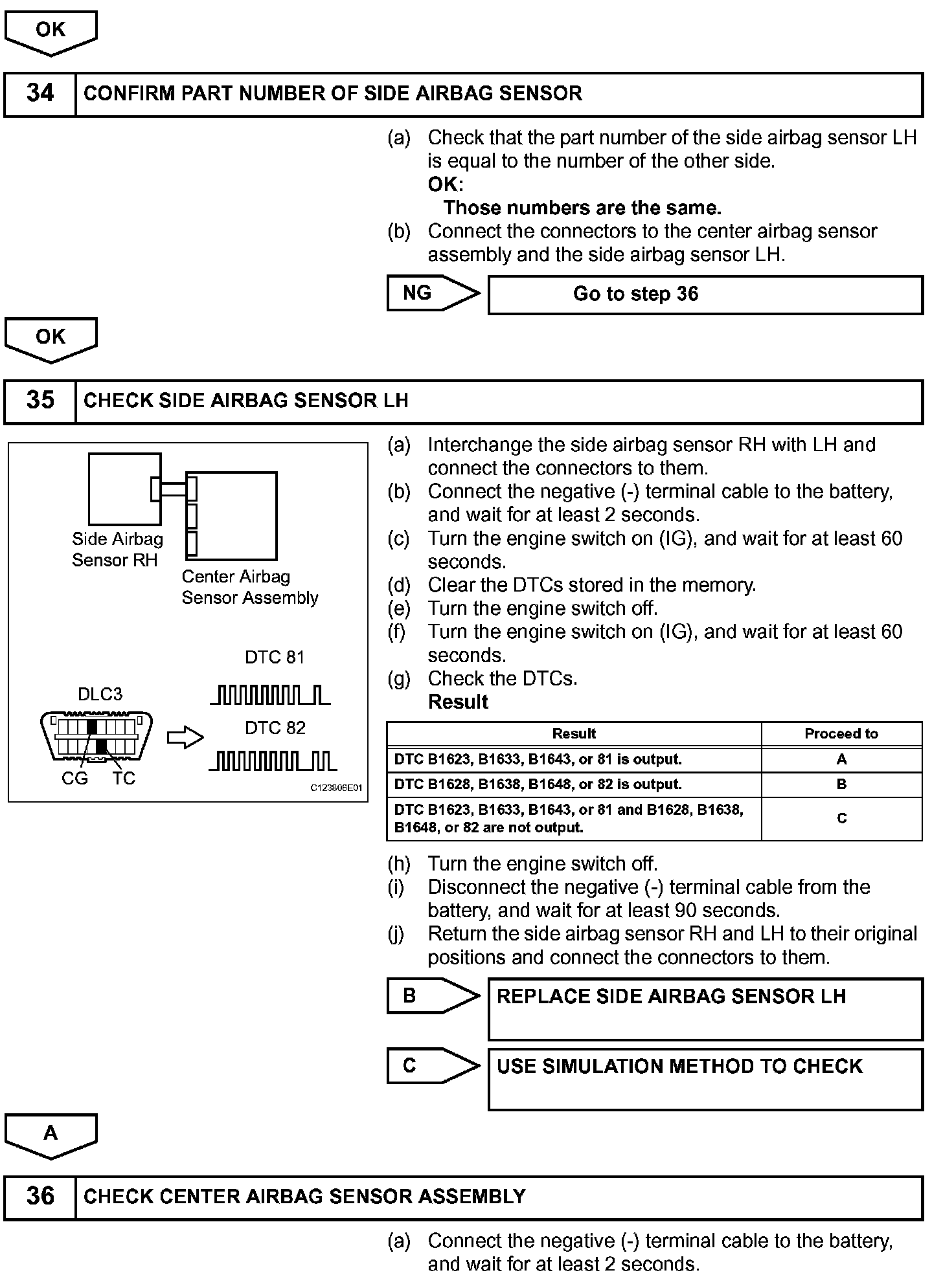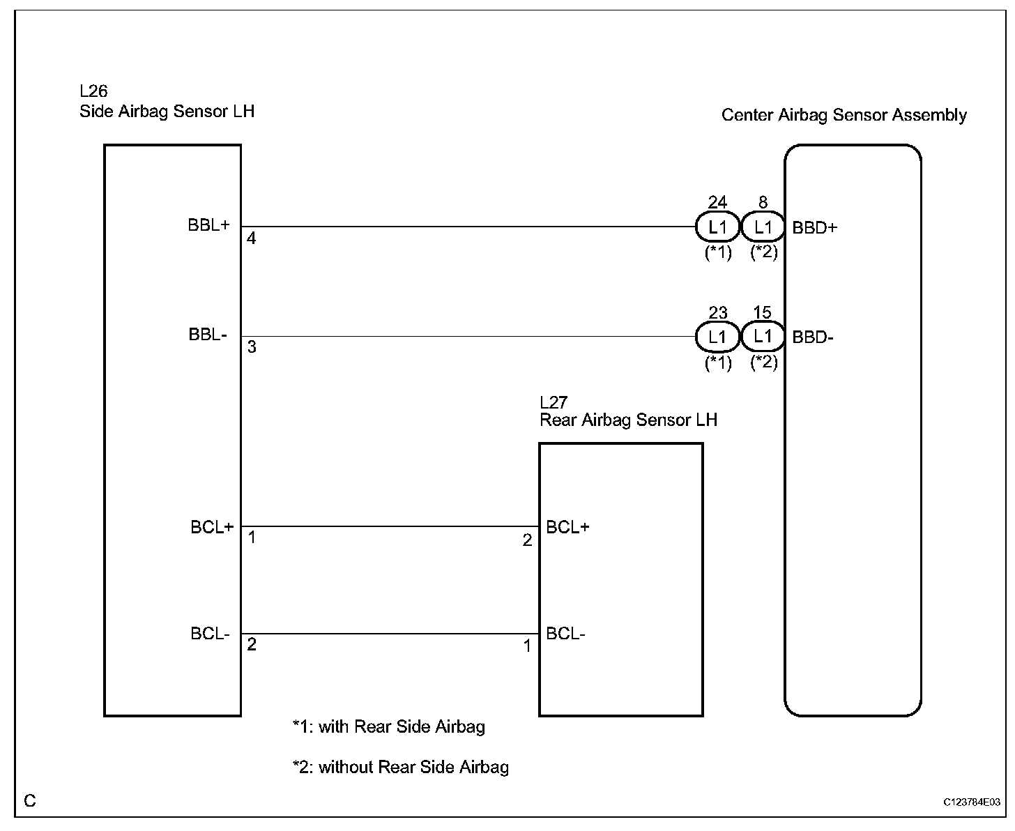 The circuit for the side collision sensor LH (to determine deployment of the front seat side airbag assembly LH and curtain shield airbag assembly LH) is composed of the center airbag sensor assembly, side airbag sensor LH, and rear airbag sensor LH.