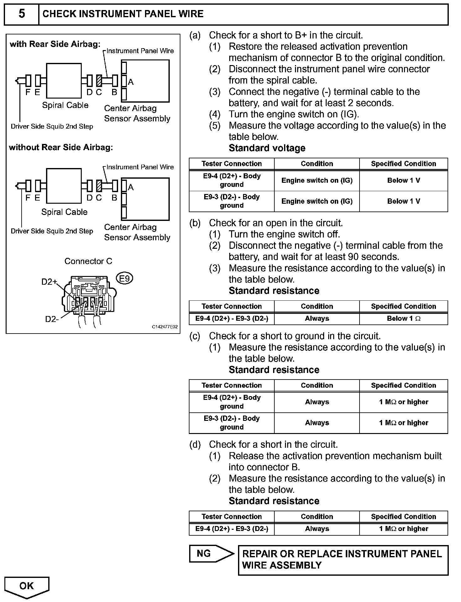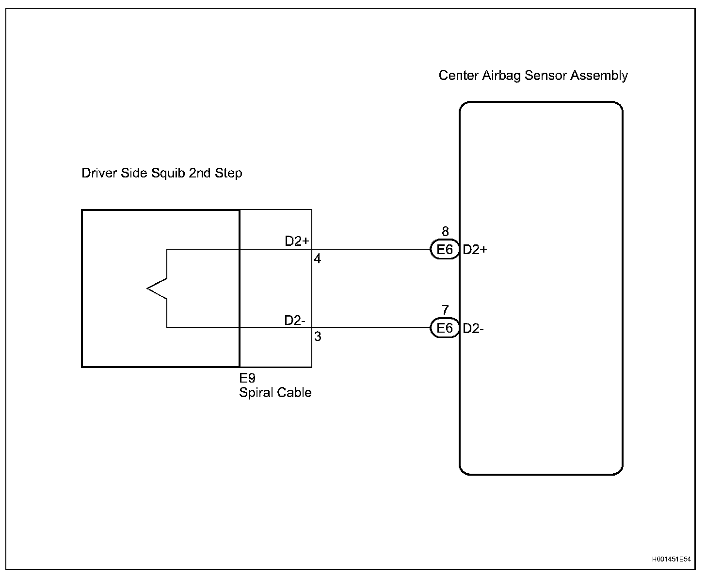 The driver side squib 2nd step circuit consists of the center airbag sensor assembly, the spiral cable, and the steering pad.