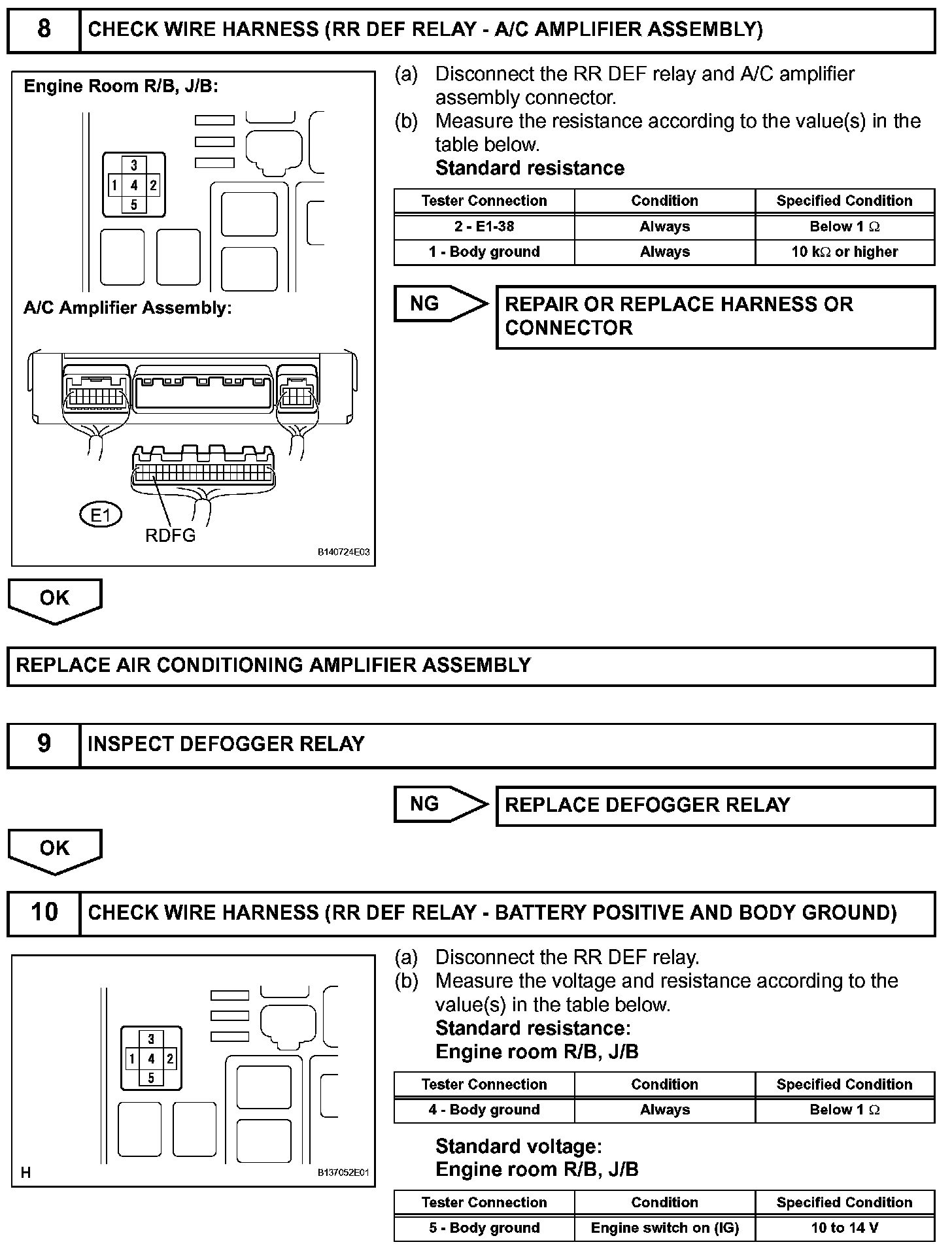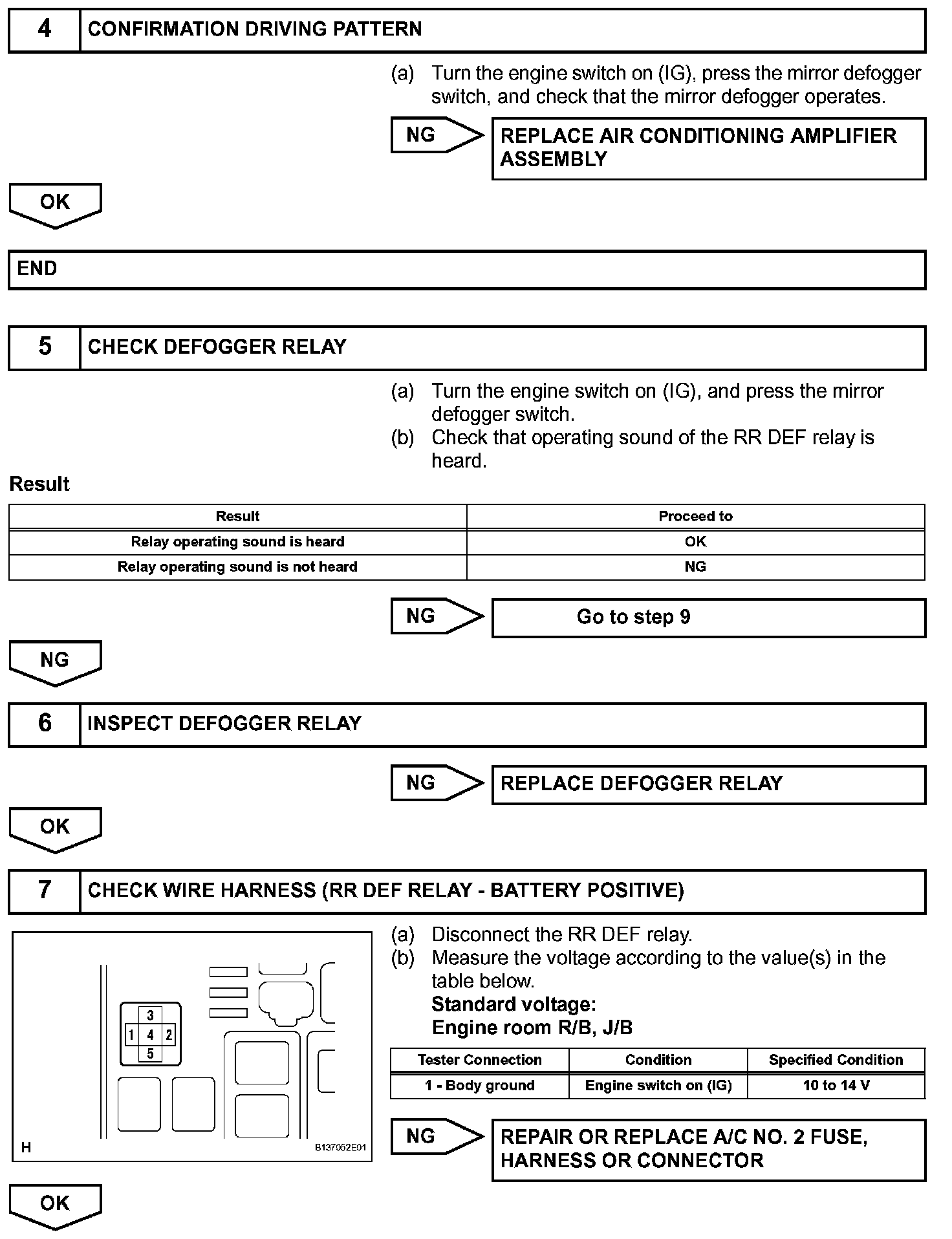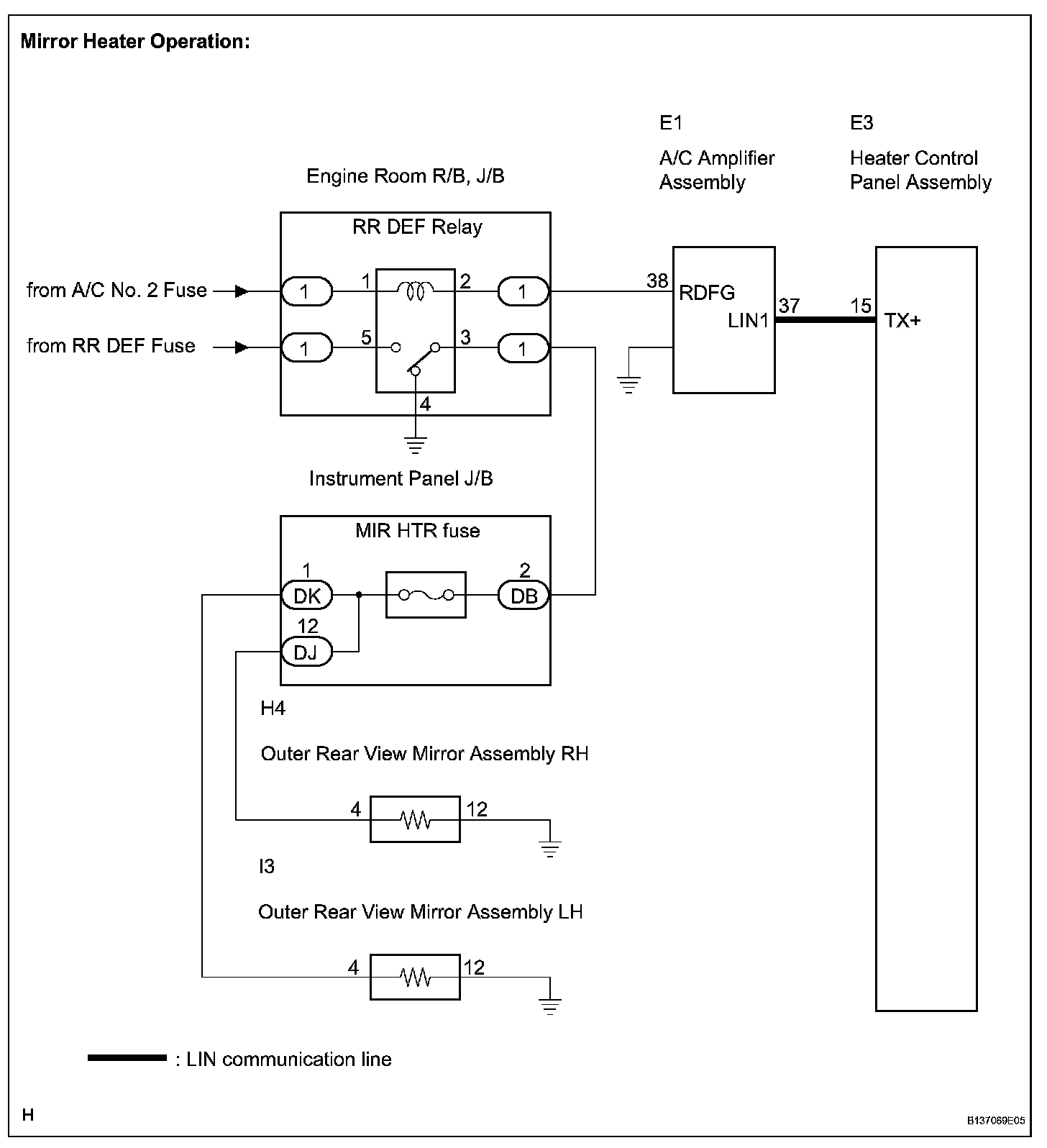 Mirror Heater Does Not Operate With Rear Defogger SwitchDESCRIPTIONWhen the mirror defogger switch, which is built into the heater control assembly, is operated, operation signals are transmitted to the A/C amplifier assembly through LIN. When the amplifier assembly receives the signals, it turns on the RR DEF relay to operate the mirror defogger.