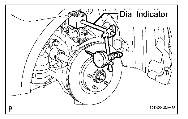 (c) If the runout exceeds the maximum value, change the installation positions of the disc and axle so that the runout will become minimal. If the runout exceeds the maximum even after the installation positions are changed, check the bearing play in the axial direction and the axle hub runout. If the bearing play and the axle hub runout are normal and if the disc thickness is not within the specified range, grind the disc. If the disc thickness is less than the minimum, replace the disc.