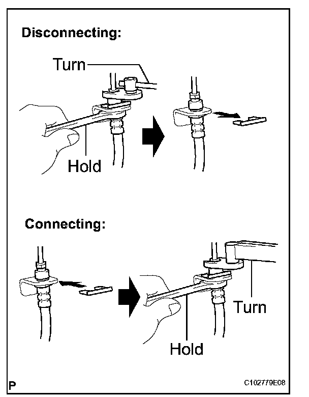 (a) Hold the flexible hose with a wrench and disconnect the brake tube with a union nut wrench without deforming the tube.