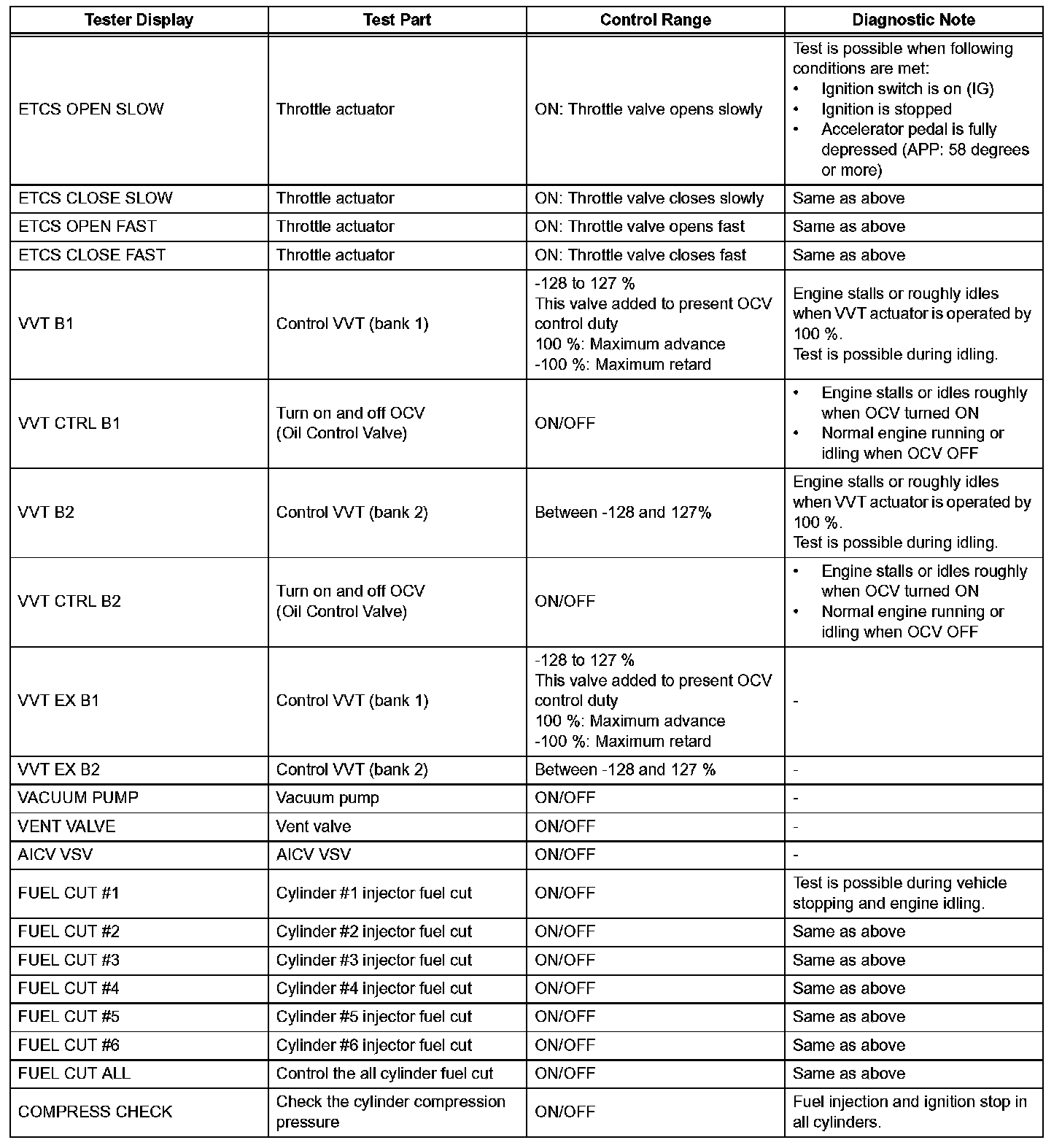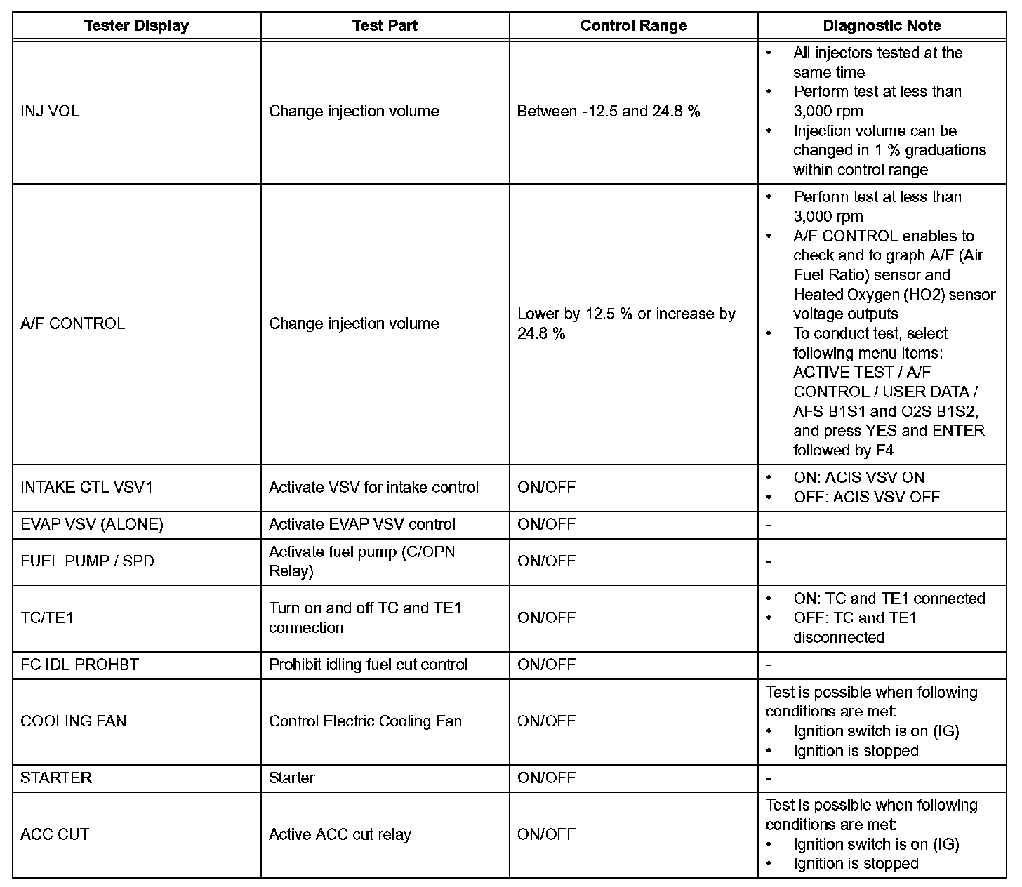 e. Perform the ACTIVE TEST by referring to the table.