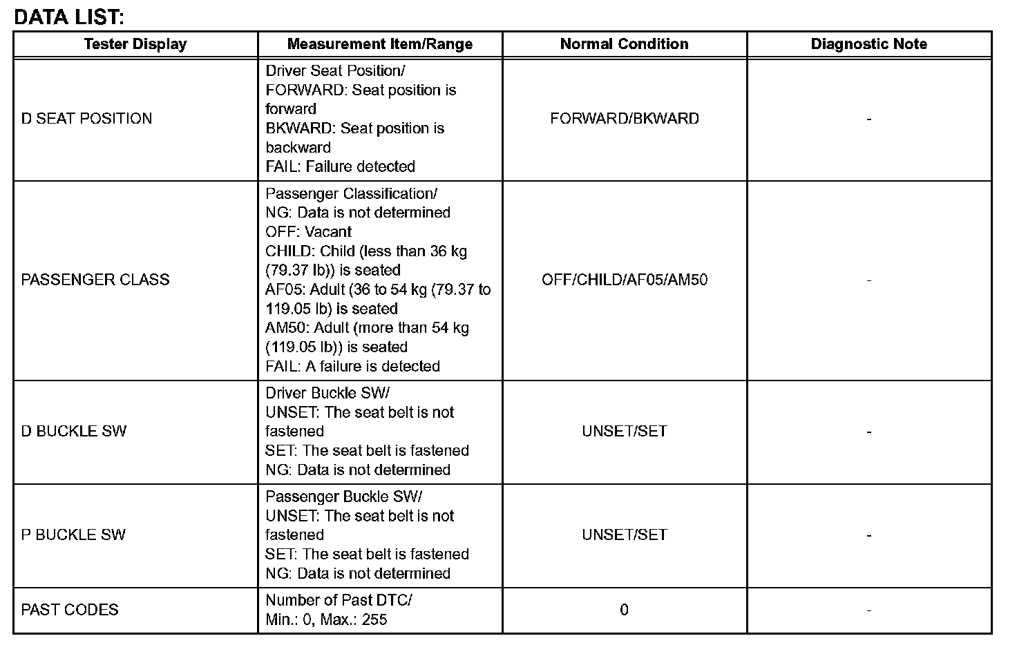 1. DATA LIST FOR CENTER AIRBAG SENSOR ASSEMBLY