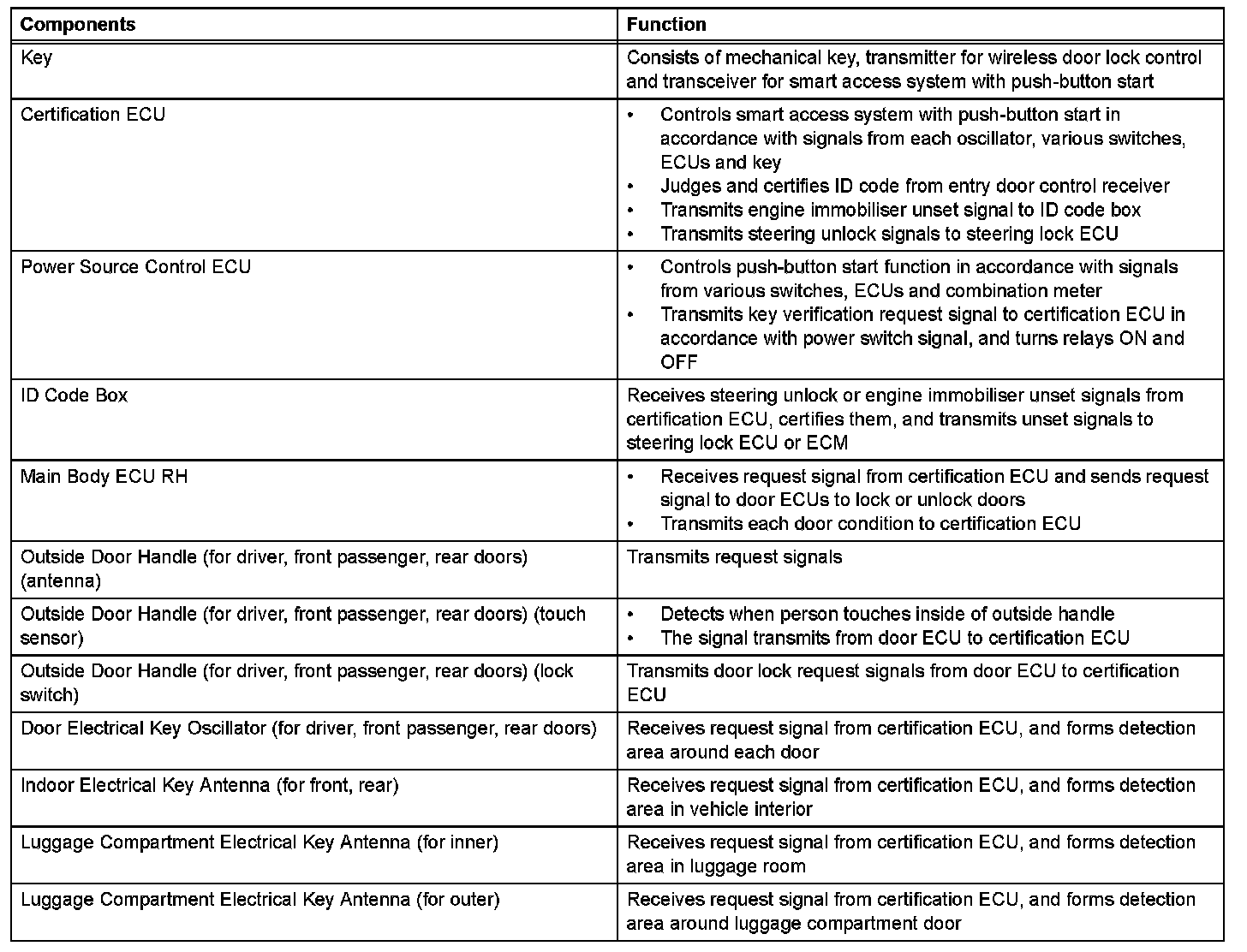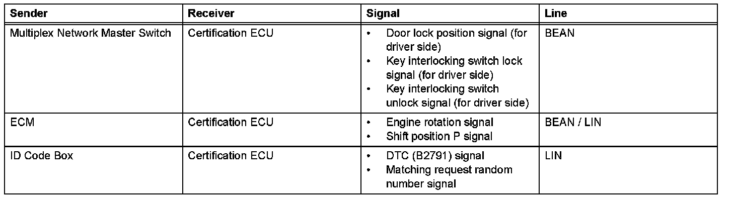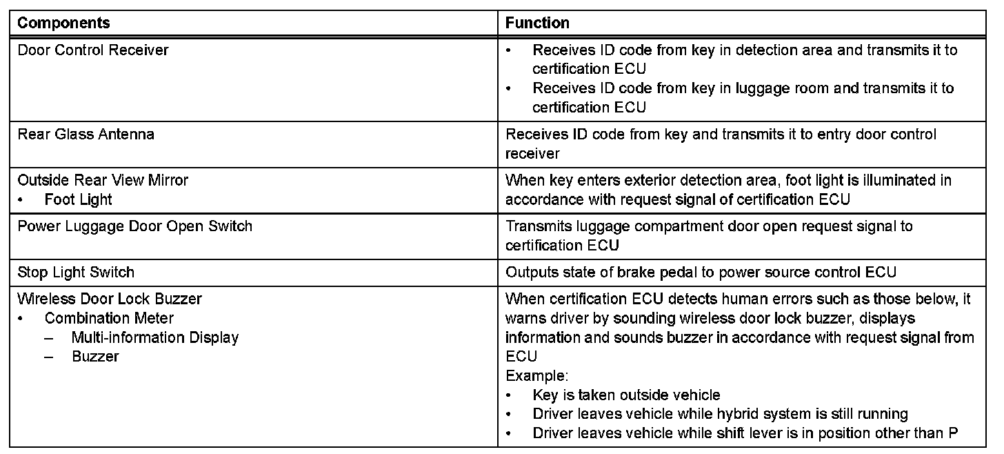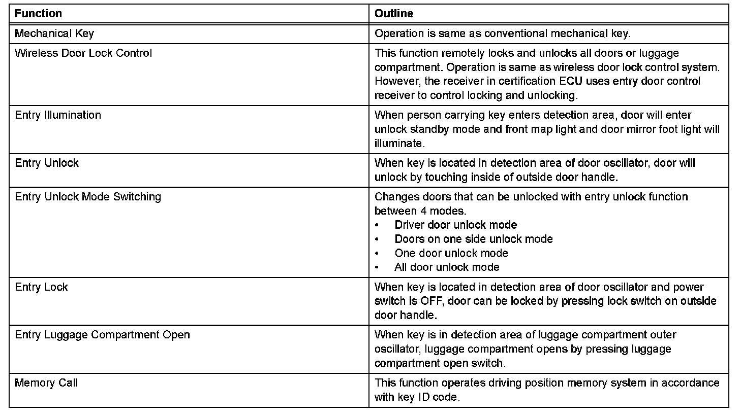 - This system is controlled by the certification ECU. When the certification ECU detects the presence of the key in one of the detection areas, it identifies and checks the ID code, and outputs operation signals to the related ECU in accordance with their functions.