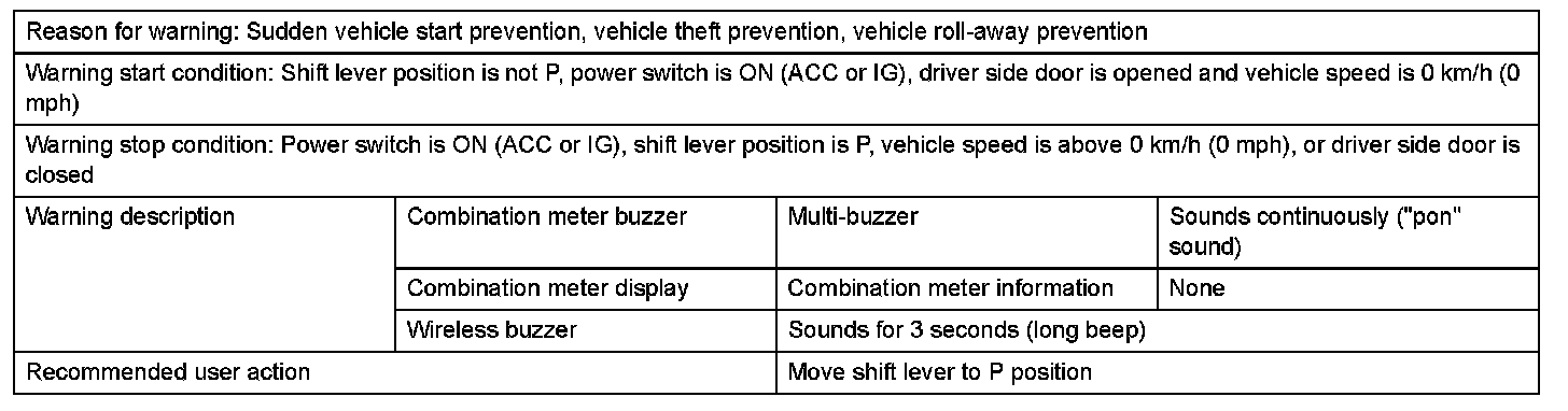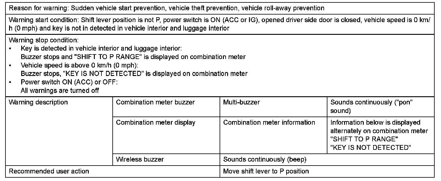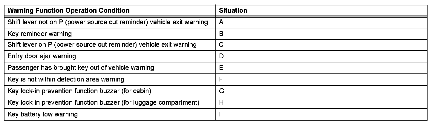 1. With shift lever in position other than P, door is opened and vehicle exit (while holding key) is attempted