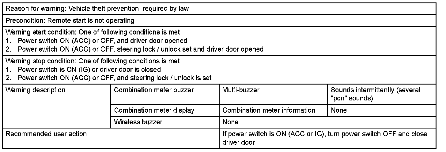 When any of the situations below occur, the smart access system with push-button start responds to alert the driver.