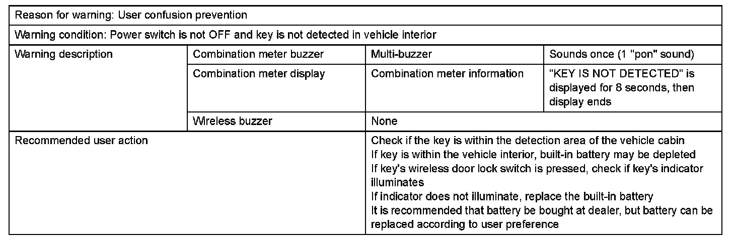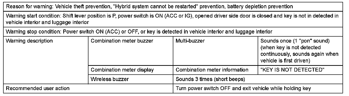 1. With power switch in position other than OFF, key is brought out of vehicle by passenger