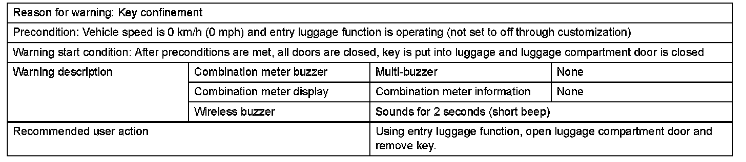 b. If the luggage compartment is closed with the key in it, the alarm will sound and the luggage compartment can be opened only when all the doors are locked in order to prevent key confinement in the vehicle.