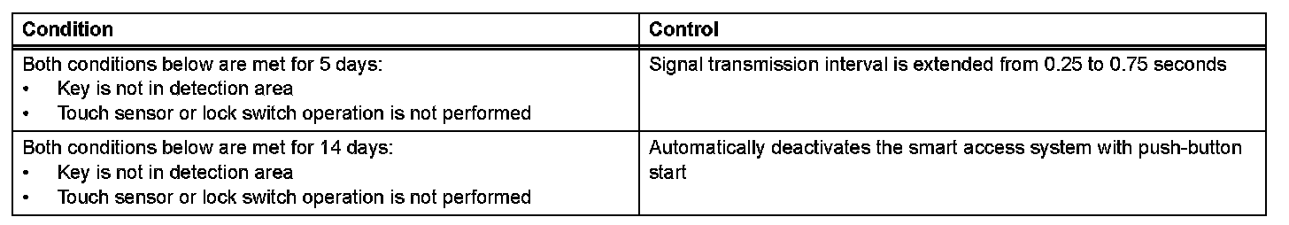 In the smart access system with push-button start, signals are emitted outside of the vehicle at a prescribed interval (0.25 seconds) when the doors are locked. Therefore, the vehicle battery could be drained if the vehicle remains parked for a long time. For this reason, the controls listed below exist.