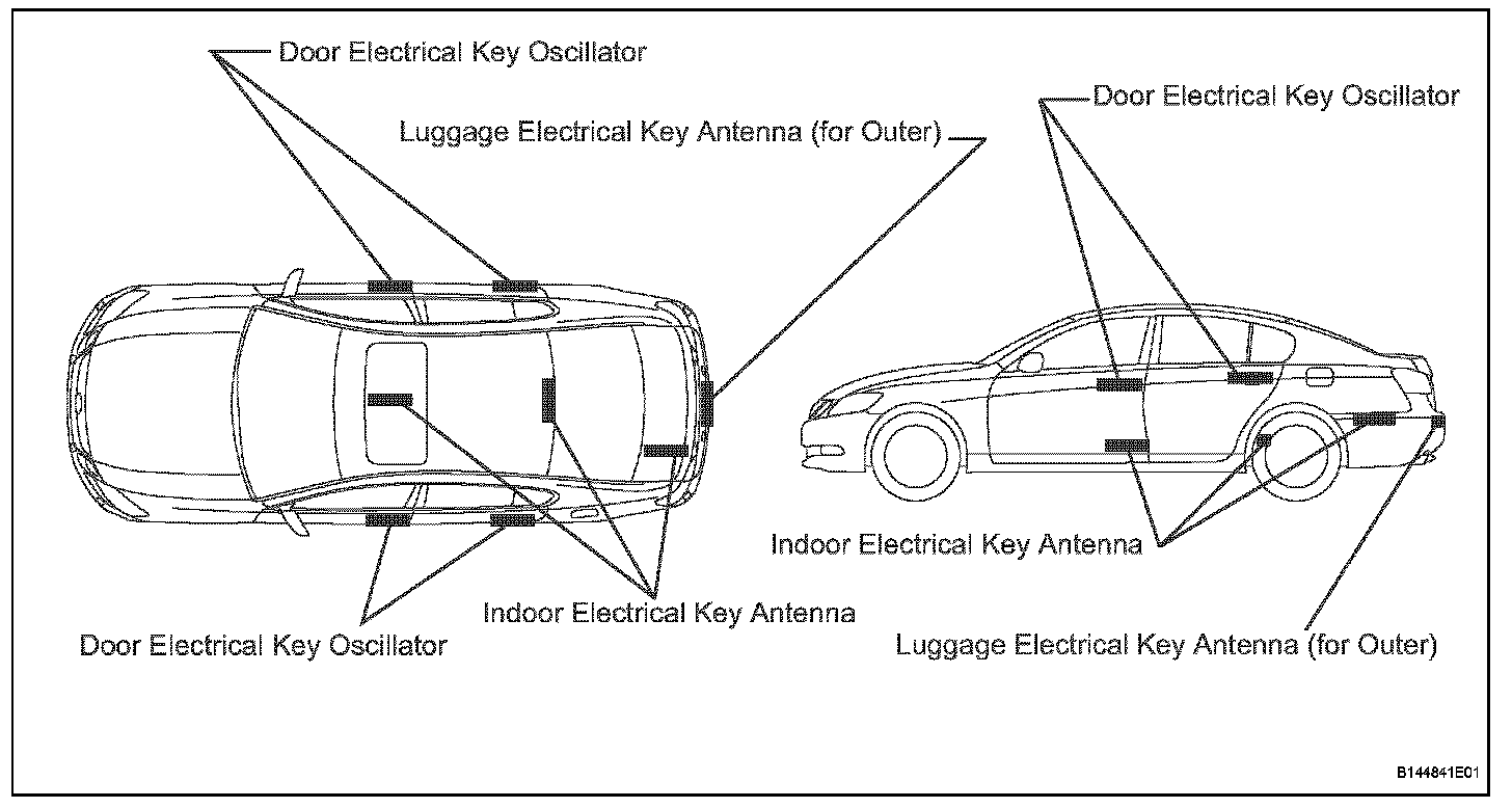 5. If the key is outside the vehicle but is very close to a window or door handle (the ECU determines that the key is inside the vehicle) and the transmitter or mechanical key is used to lock the doors (entry lock is not used), entry unlock will not operate. To unlock the doors, perform a wireless door unlock operation. The entry lock function operates in this way to prevent the user from unintentionally unlocking the doors from outside the vehicle. For example, when a user operates the wireless door lock operation from inside the vehicle, radio waves from a door oscillator may leak into the vehicle interior and the doors may unlock.