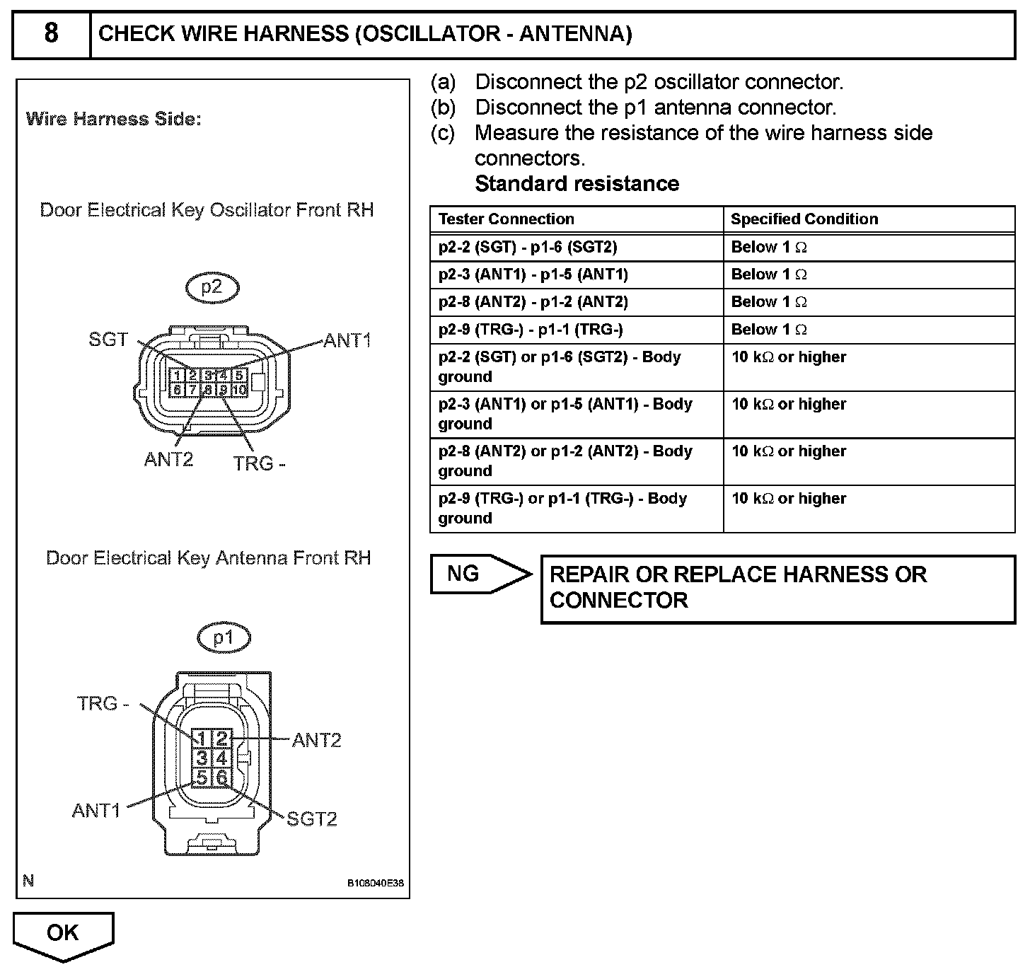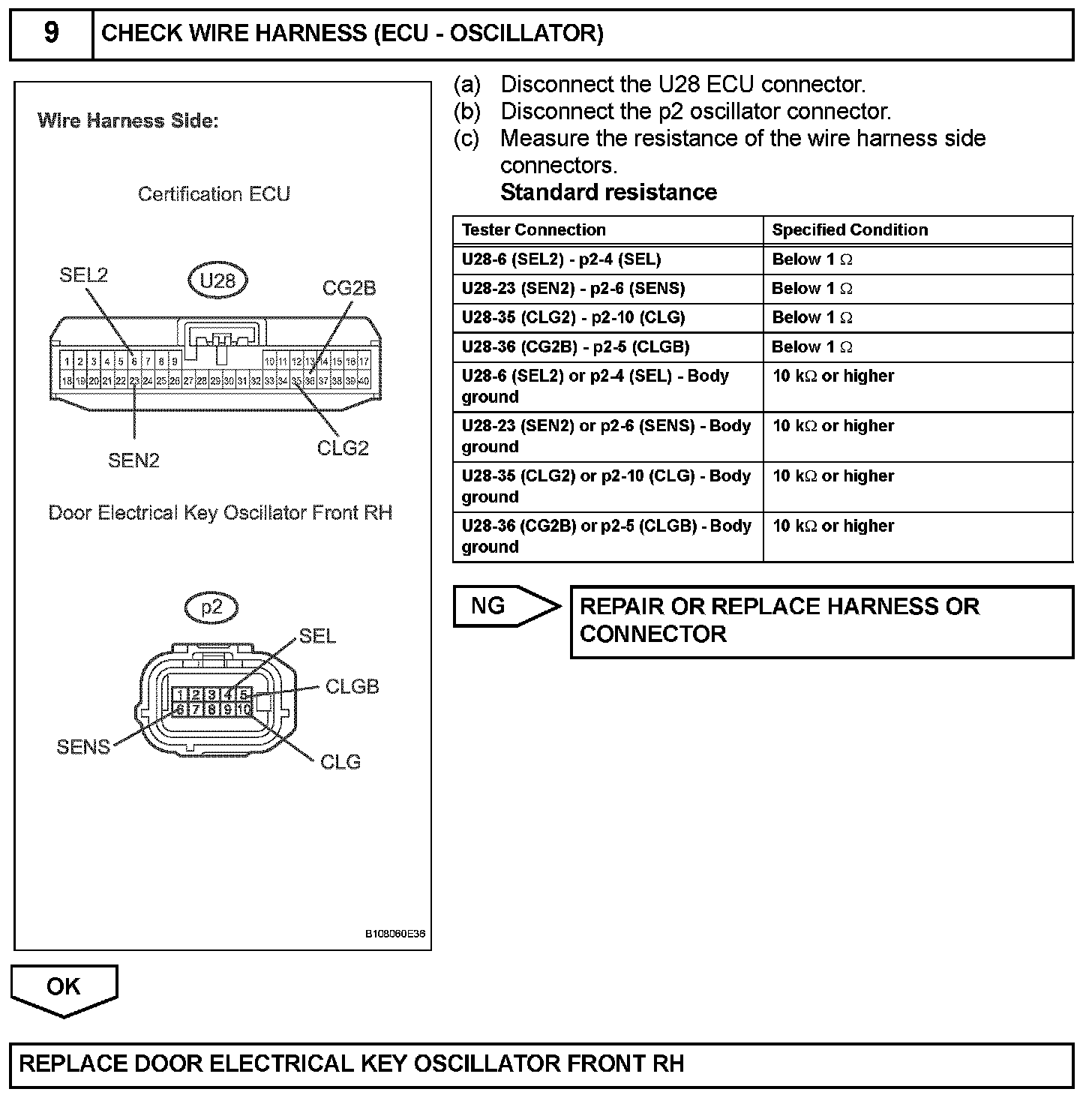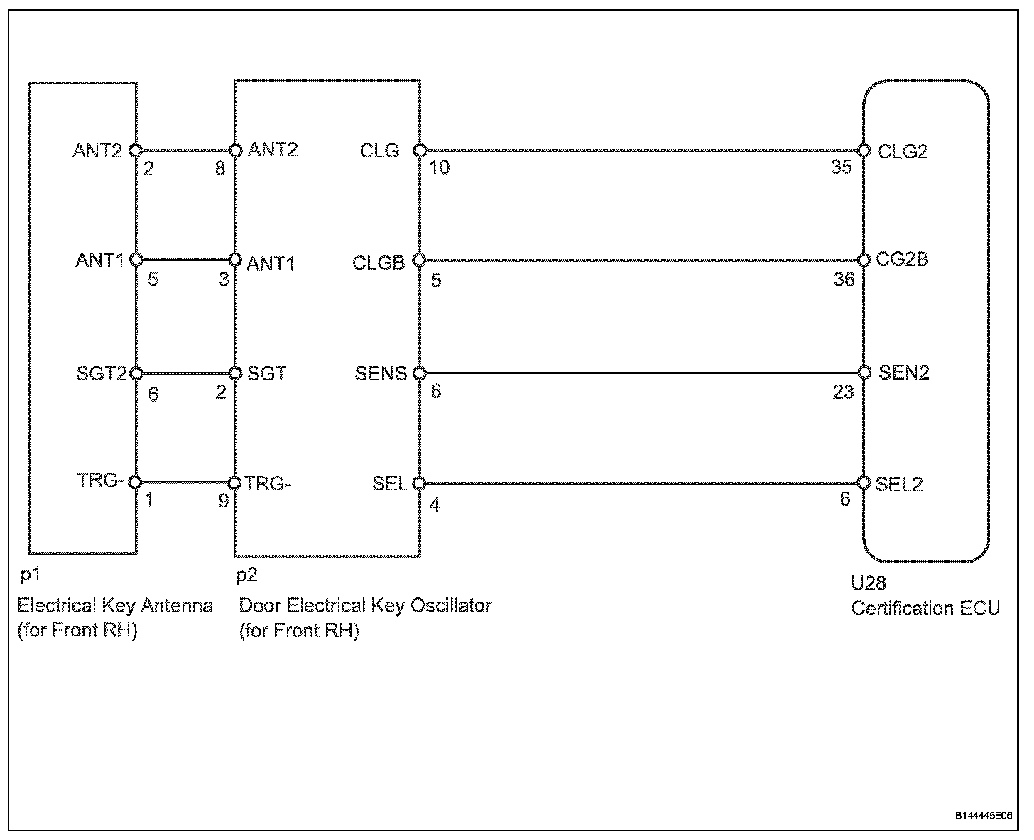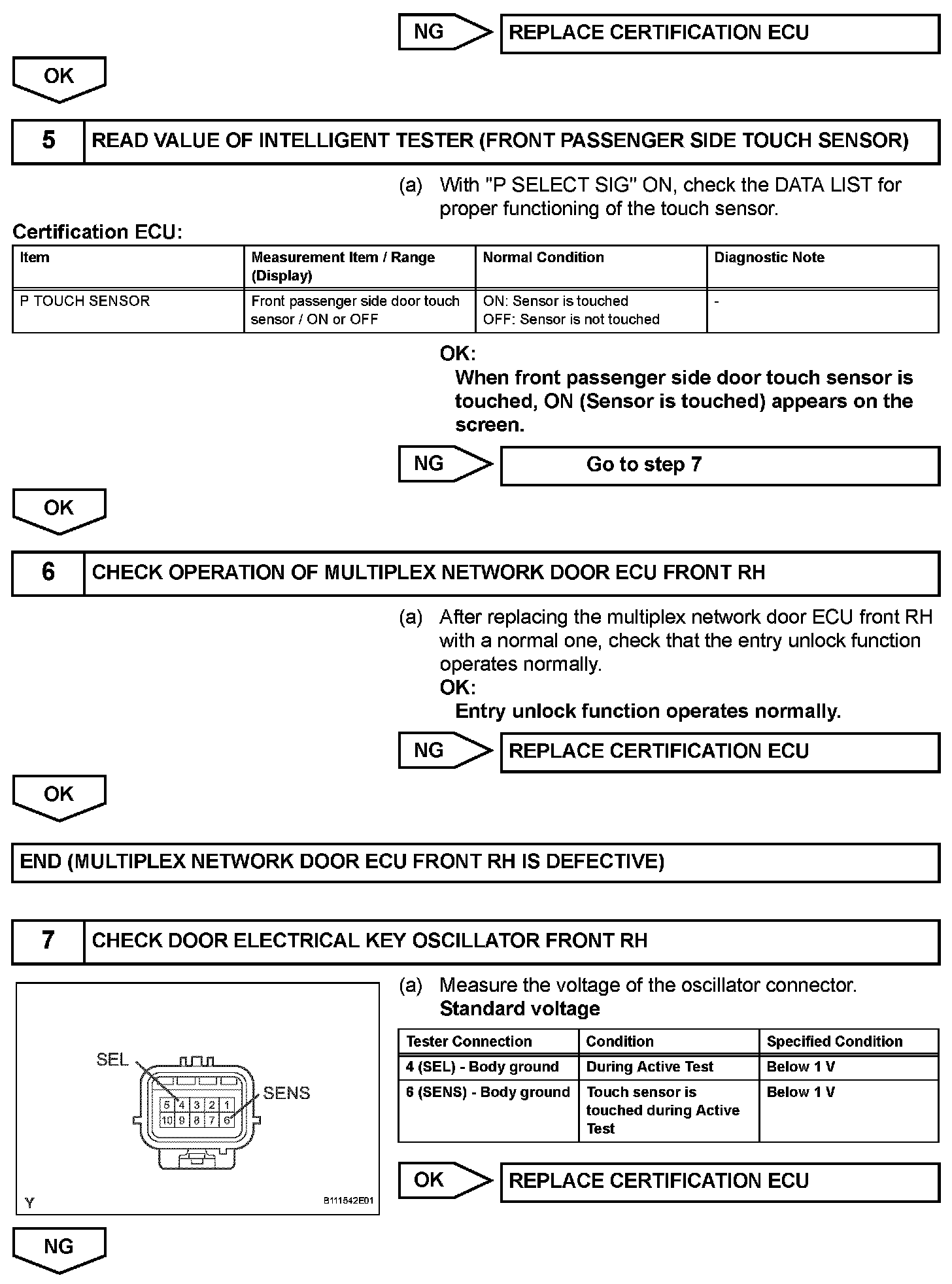 When an ID code from the door electrical key oscillator front RH matches an ID code from the key, the certification ECU outputs a SEL signal (Lo when output) to the door electrical key oscillator front RH, activates the touch sensor inside the outside door handle, and enters unlock standby mode. When the touch sensor is touched, the door electrical key oscillator front RH sends a SENS signal (Lo when output) to the certification ECU and the certification ECU sends an unlock signal to the front passenger side door lock.
