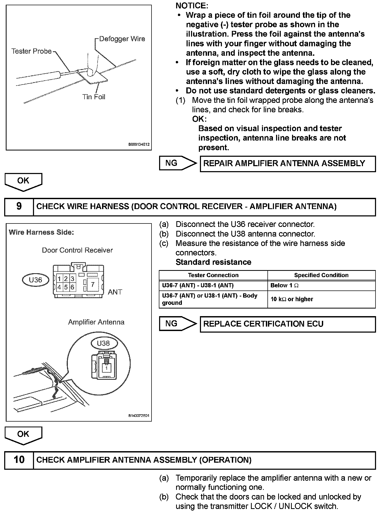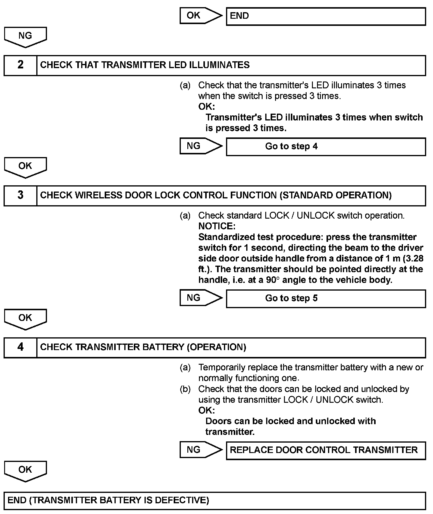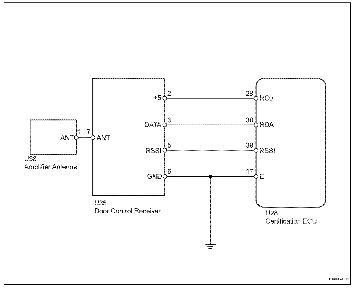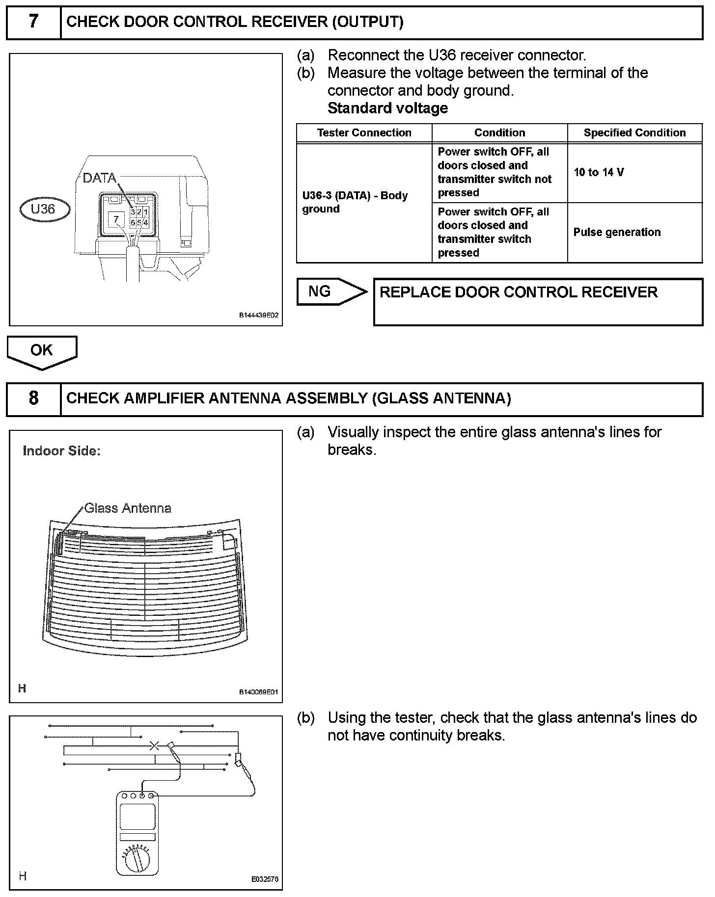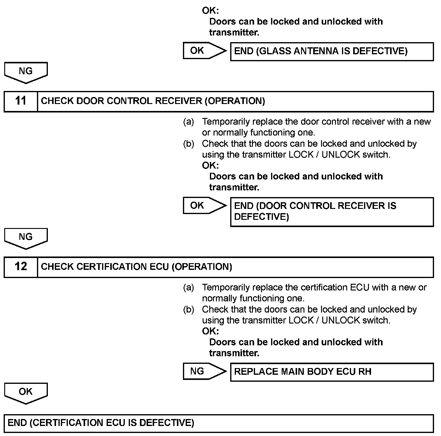The door control receiver receives a signal from the transmitter and send the signals to the main body ECU RH through the certification ECU. The main body ECU RH then controls all doors by sending LOCK / UNLOCK signals to each door ECU, hazard flasher relay operation signals to the turn signals flasher relay (turn signal lights) and wireless door lock buzzer sound signals to the wireless door lock buzzer.
