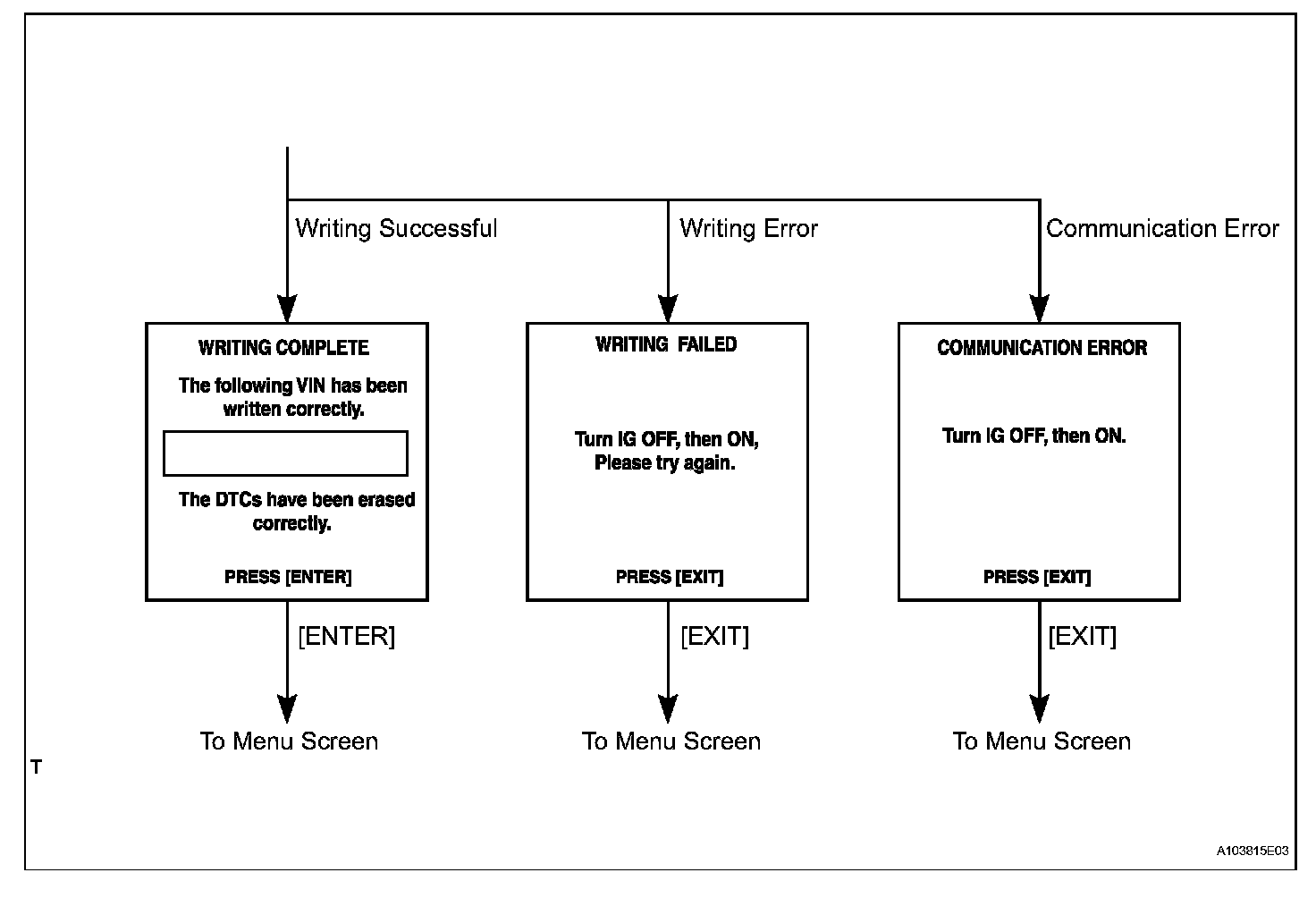 a. The VIN writing process is explained using a flowchart as shown. This process allows the VIN to be input into the HV control ECU. If the HV control ECU is changed, or the HV control ECU VIN and the vehicle's VIN do not match, the VIN can be registered, or overwritten in the HV control ECU by following this procedure.