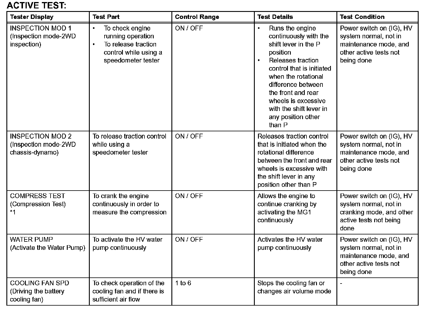 - For items marked with *1 in the chart, the intelligent tester will display a communication error and the vehicle's READY light will turn off when the active test is completed. If the tester will be used on the vehicle again, turn the power switch off and then on (READY) again to restart the tester.