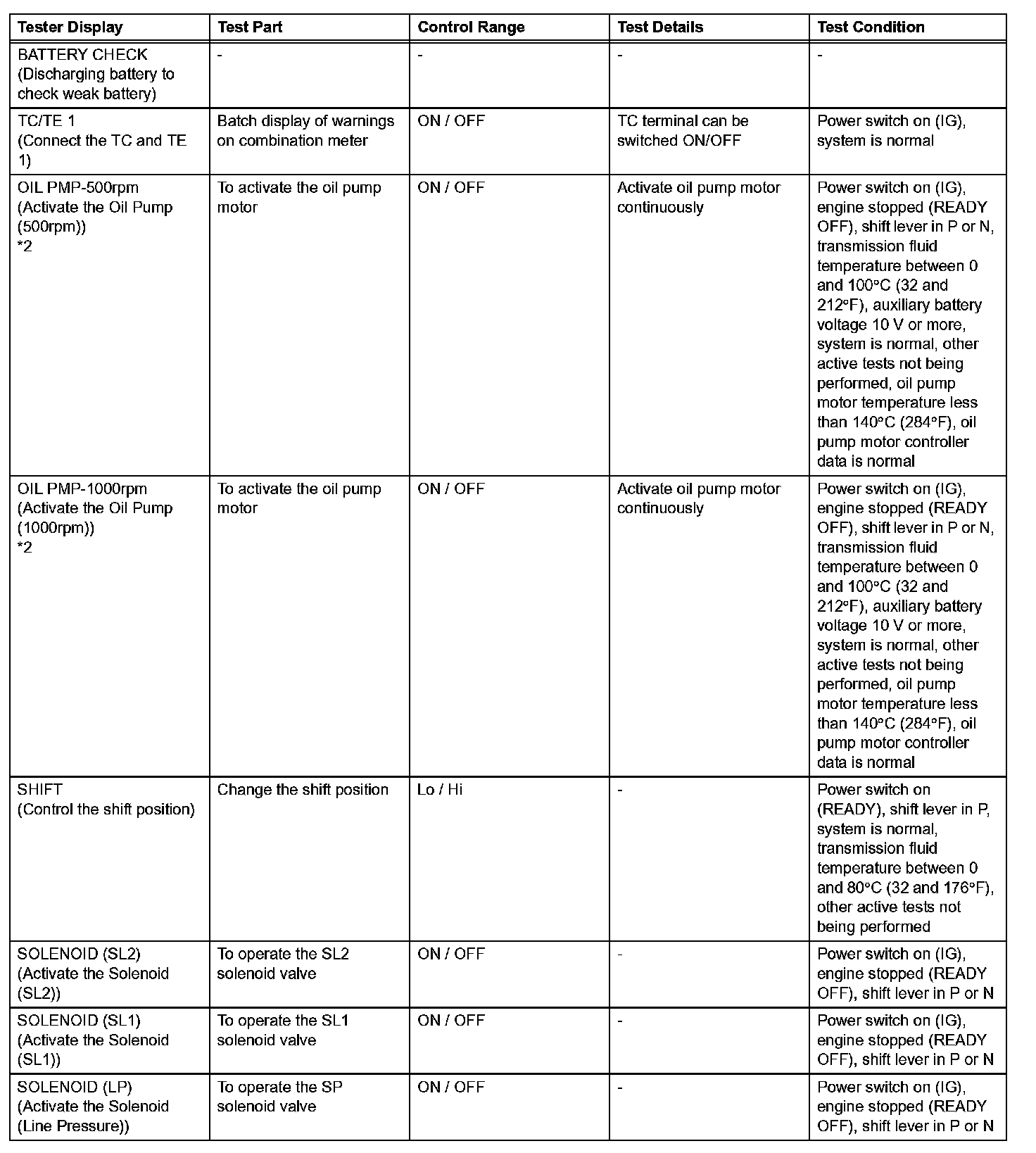 - For items marked with *2 in the chart, the OIL PMP active test can be performed for 30 seconds. A one minute interval is required between active tests.
