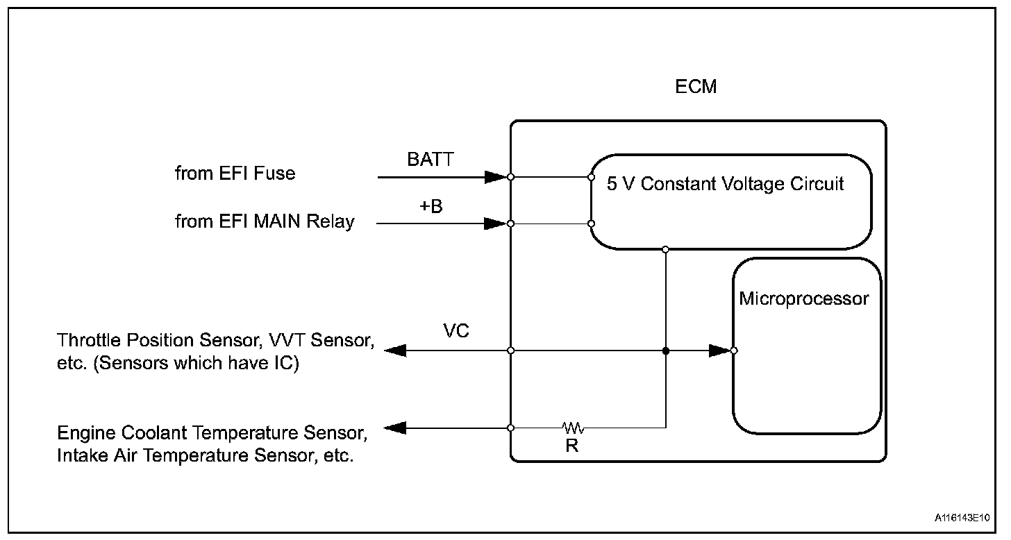 The ECM constantly generates 5 V power from the battery voltages supplied to the +B (BATT) terminal to operate the microprocessor. The ECM also provides this power to the sensors through the VC output circuit.