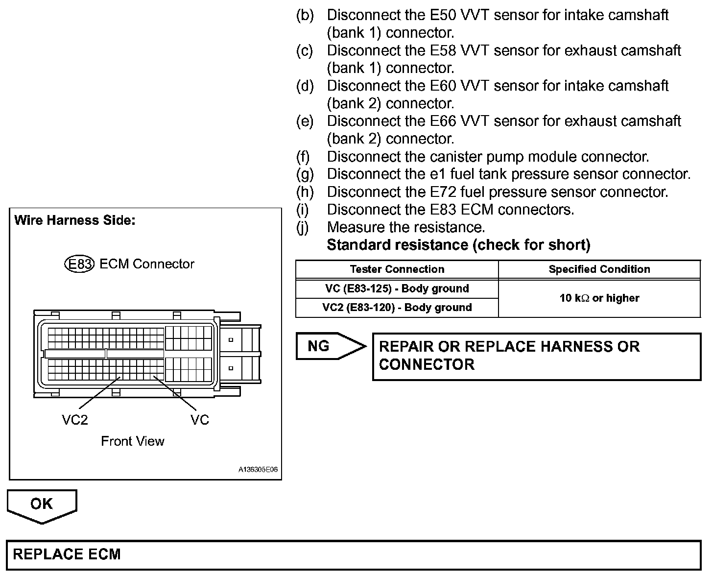 When the VC circuit is short-circuited, the microprocessor in the ECM and sensors that are supplied with power through the VC circuit are inactivated because the power is not supplied from the VC circuit. Under this condition, the system does not start up and the MIL does not illuminate even if the system malfunctions.