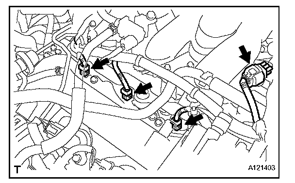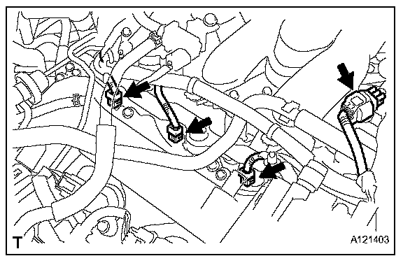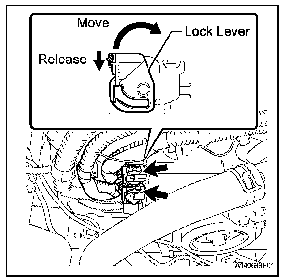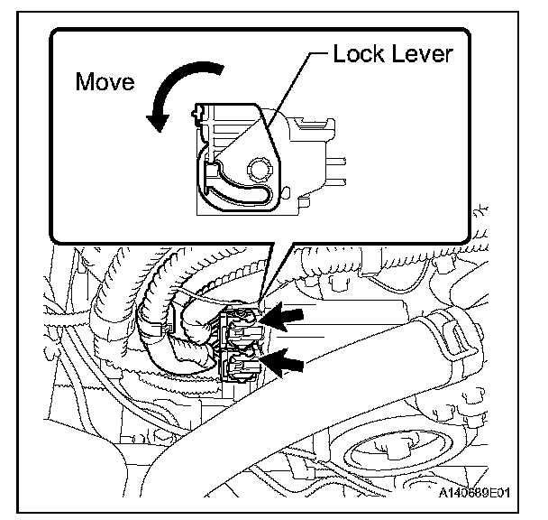 5. Disconnect the 2 injector driver connectors by the following procedures: 1) move the lock lever in the direction indicated by the arrow to release the connector lock, 2) disconnect the connectors with wire harness lock.