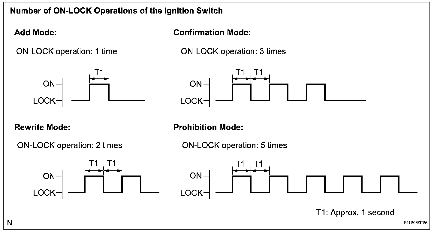 HINT: If the number of on ON-LOCK operations of the ignition switch is 0, 4 or 6 or more, there will be no response (power door lock and unlock operation) to show which mode has been selected.