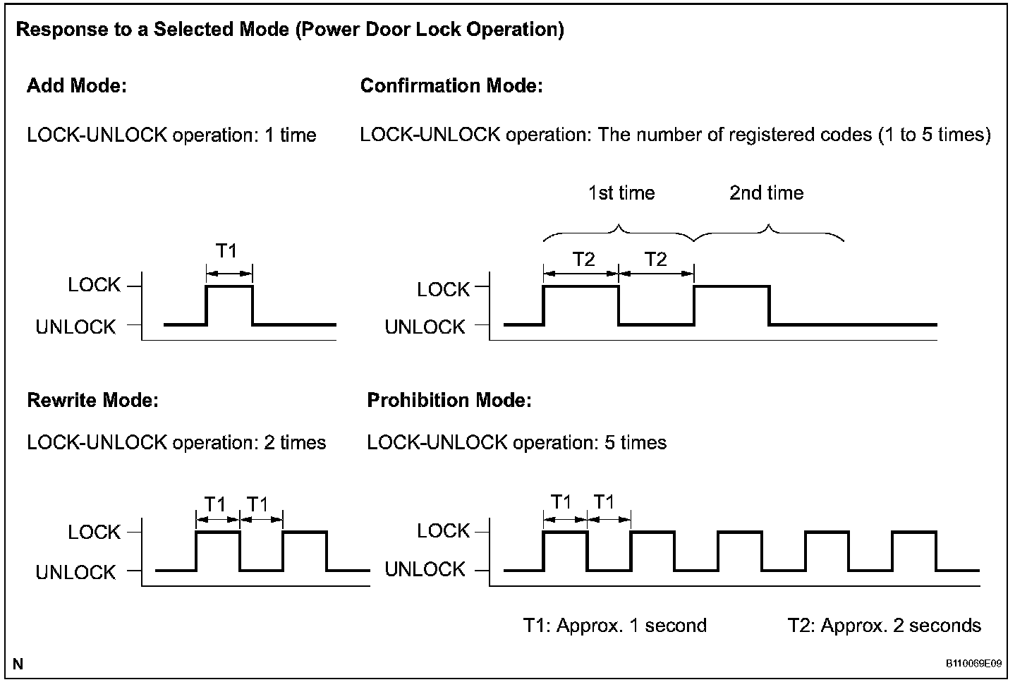8. The body ECU automatically performs the power door LOCK-UNLOCK operation within 3 seconds after the mode has been selected and informs the technician of the selected mode using the following response patterns.