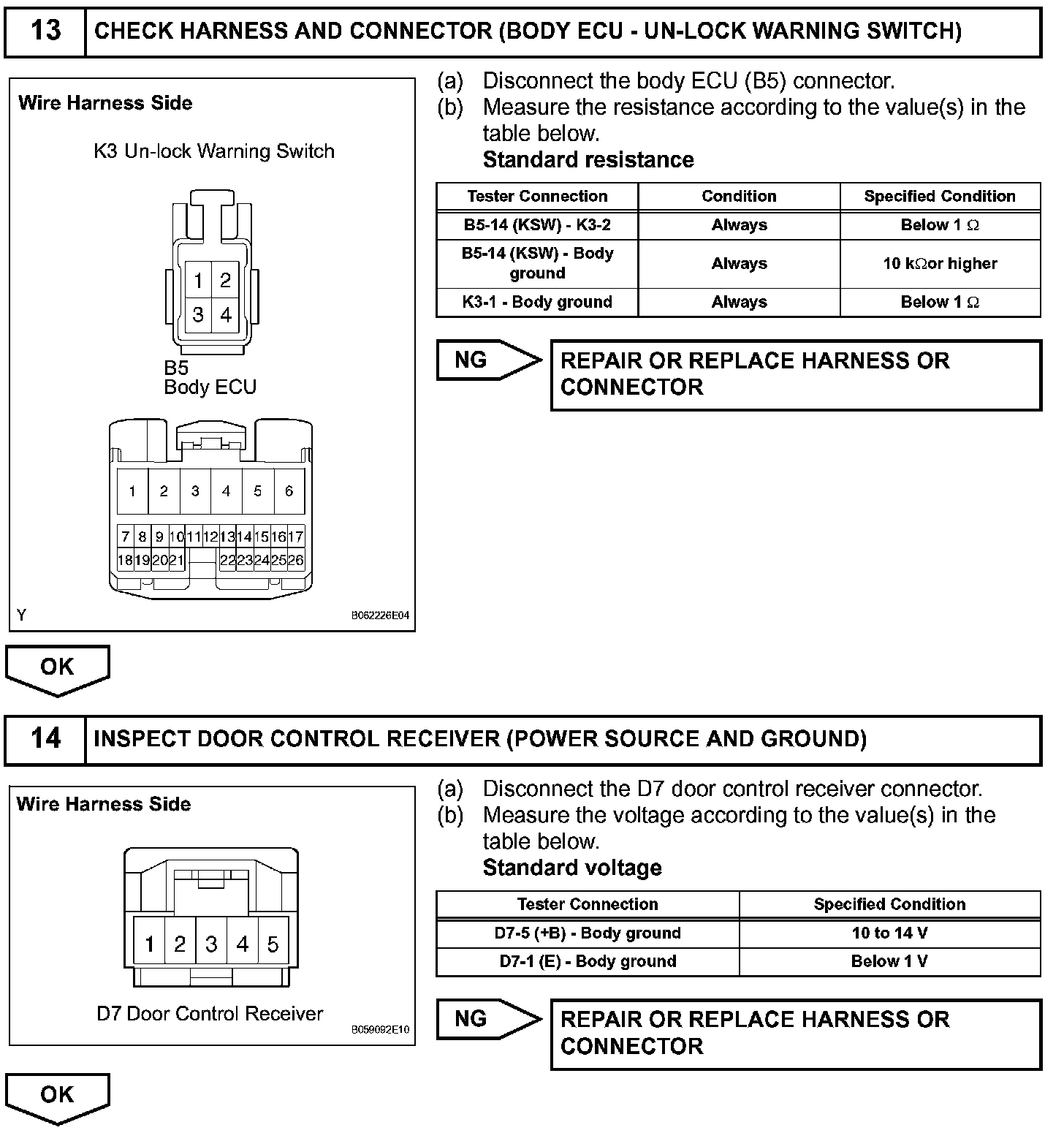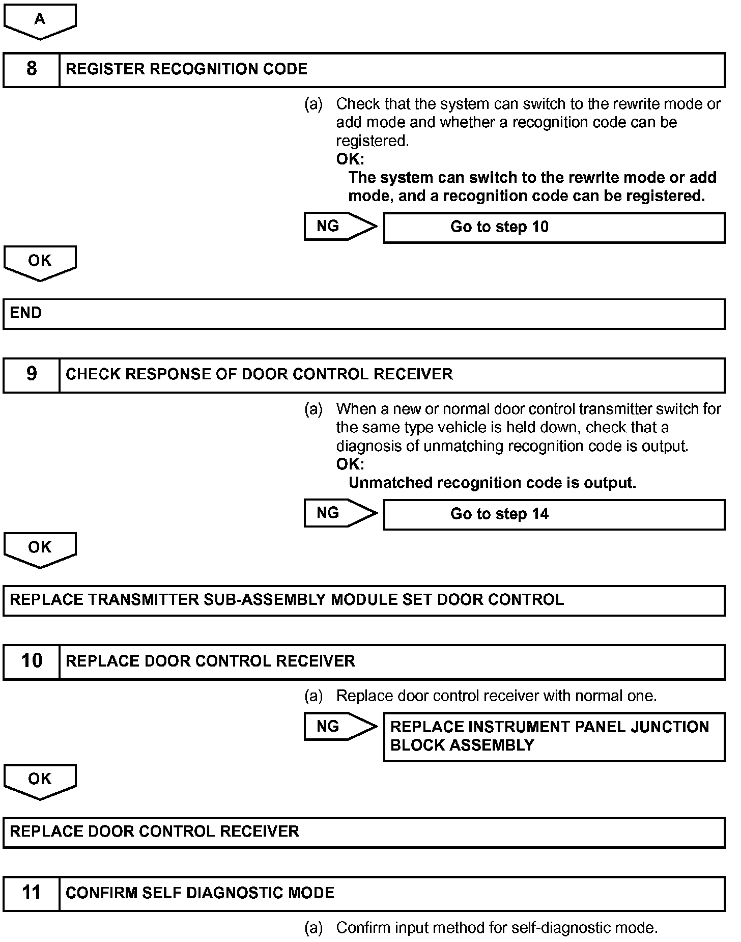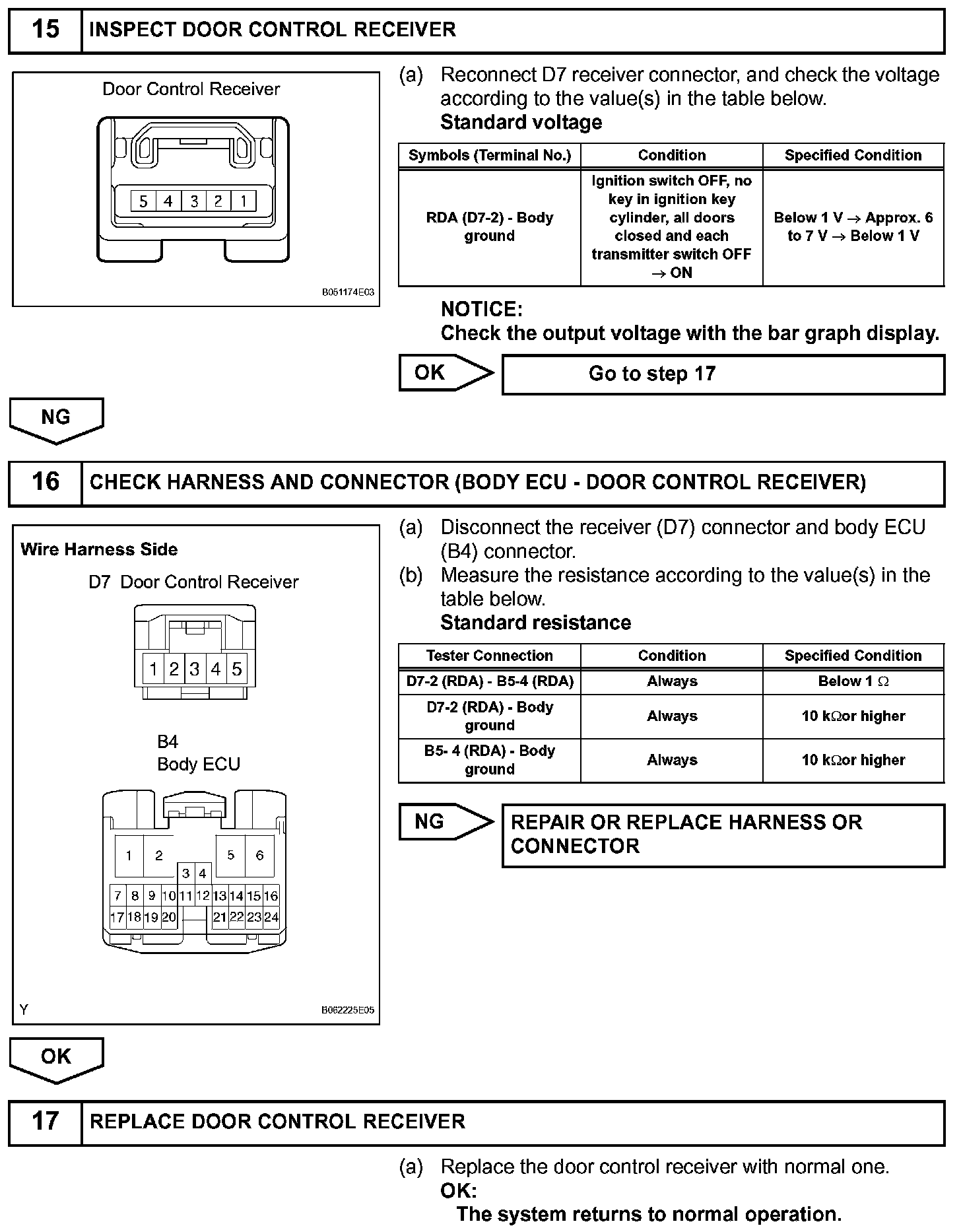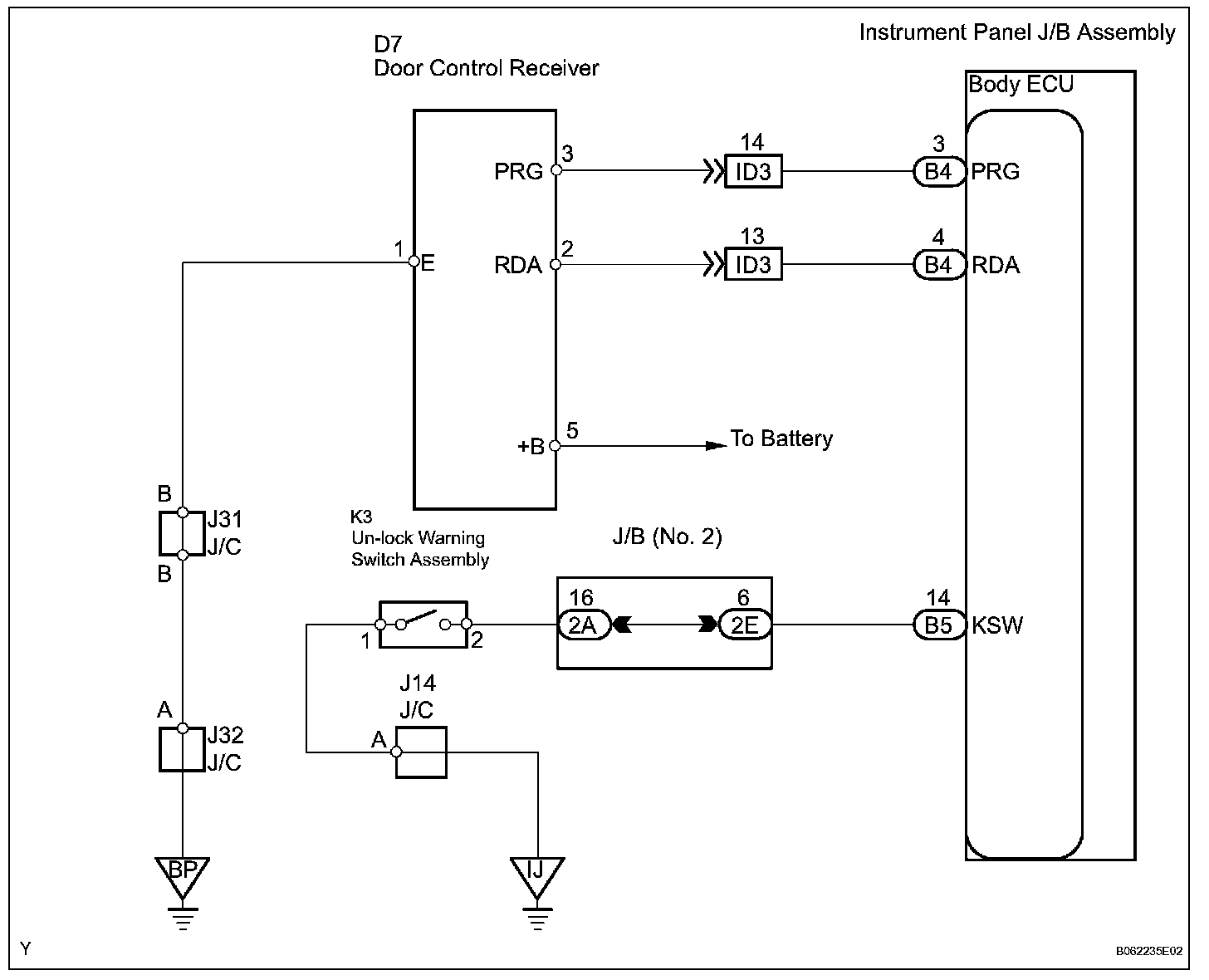 The door control receiver receives a signal from the transmitter and sends this signal to the body ECU. Then, the body ECU sends a door LOCK/UNLOCK signal to each door lock motor to control it.