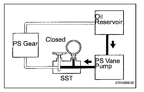 (i) With the engine idling and the valve fully opened, turn the steering wheel left or right to the full lock position. Observe the reading on the SST.