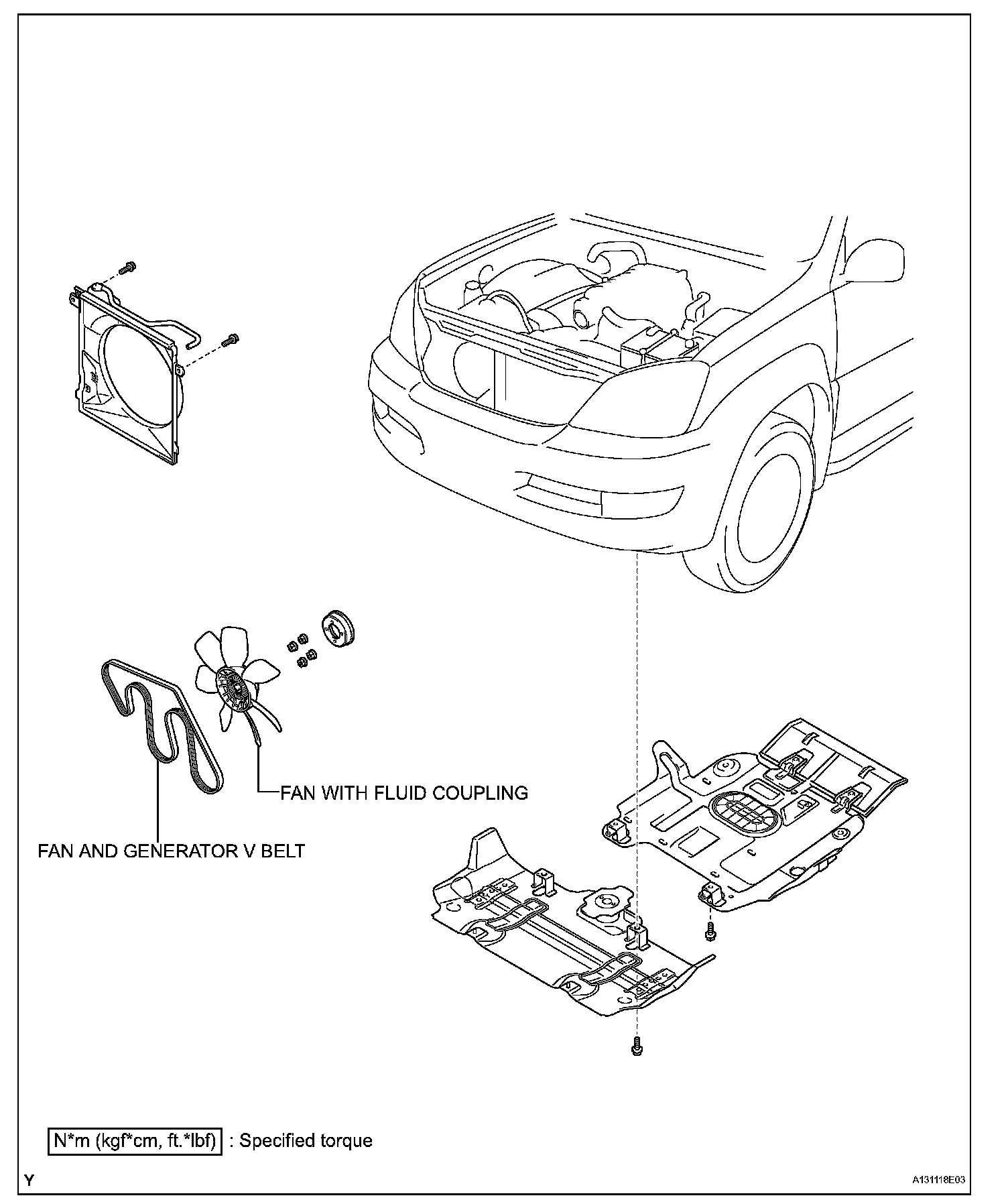 (b) Put the fan with fluid coupling and fan shroud together into the engine room.