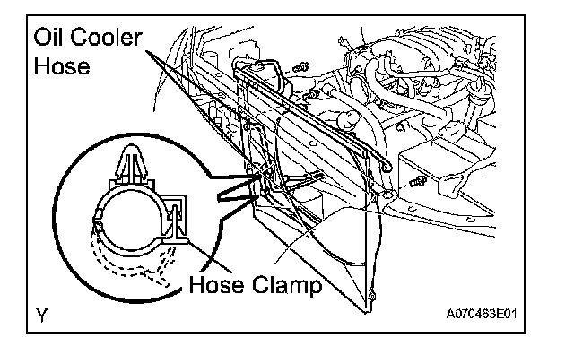 (a) Unfasten each clip and the 2 hose clamps, and then separate the 2 oil cooler hoses from the fan shroud.