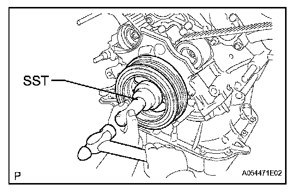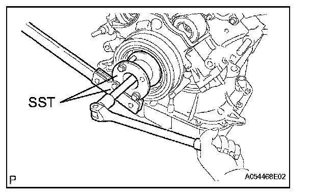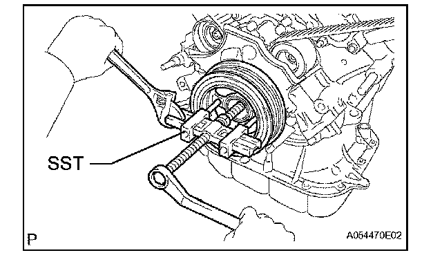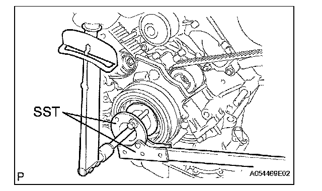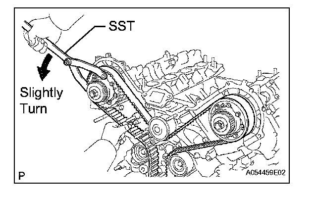 (d) Using a SST, loosen the tension between the camshaft timing pulley (RH bank) and crankshaft timing pulley by turning the camshaft timing pulley (RH bank) counterclockwise slightly.