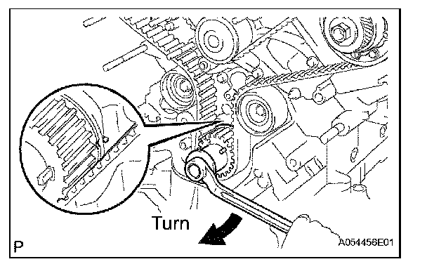 (1) Turn the hexagonal portion of the camshaft to align the timing marks of the camshaft timing pulleys and timing belt plates.