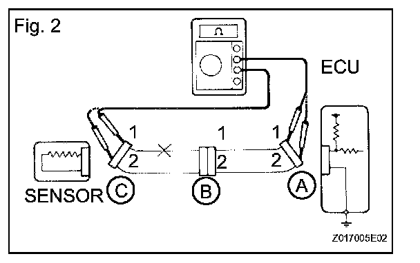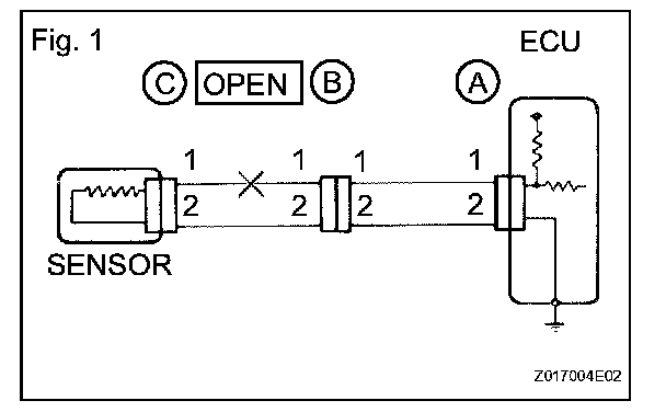 If the results match the examples, an open circuit exists in the wire harness between terminal 1 of connector B and terminal 1 of connector C.