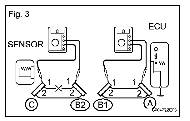 If the results match the examples, an open circuit exists between terminal 1 of connector B2 and terminal 1 of connector C.