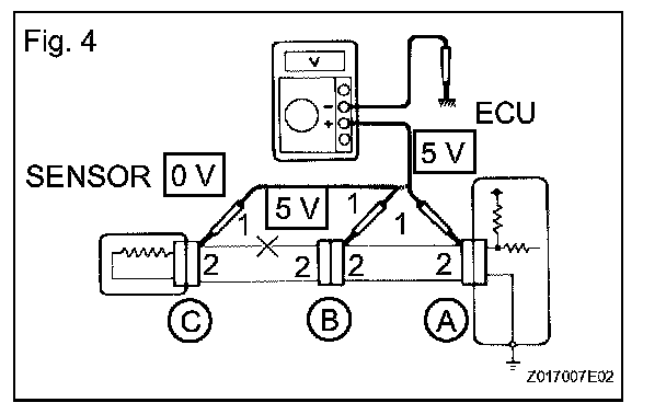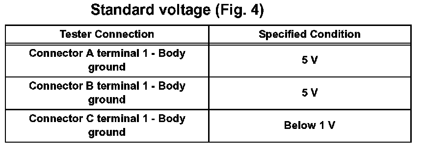 1. In a circuit in which voltage is applied to the ECU connector terminal, an open circuit can be checked by conducting a voltage check. With each connector still connected, measure the voltage between the body ground and these terminals (in this order): 1) terminal 1 of connector A, 2) terminal 1 of connector B, and 3) terminal 1 of connector C.