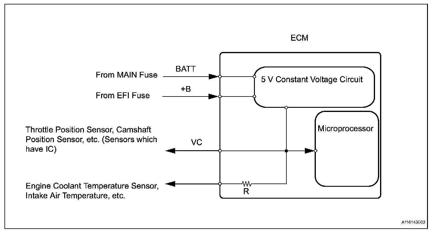 The ECM constantly generates 5 V power from the battery voltage supplied to the +B (BATT) terminal to operate the microprocessor. The ECM also provides this power to the sensors through the VC output circuit.