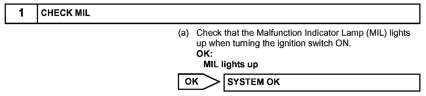 HINT: Under normal conditions, the MIL is illuminated for several seconds when the ignition switch is first turned ON. The MIL goes off when the engine is started.
