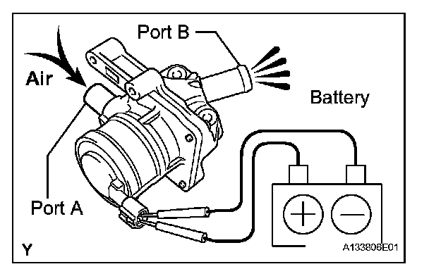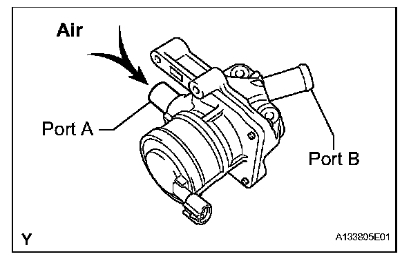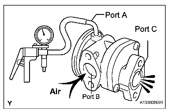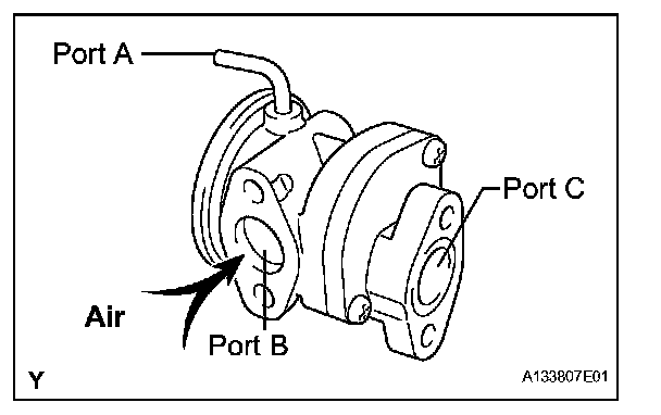 b. Apply vacuum (30 kPa (306 gf/sq.cm, 4.35 psi)) to port A, blow air into port B and check that air is discharged from port C.