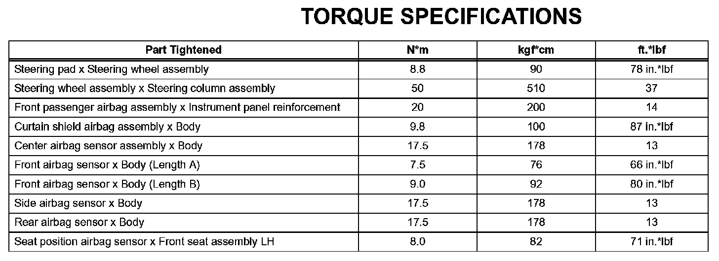 Supplemental Restraint System - Torque Specifications: