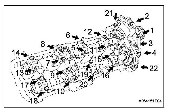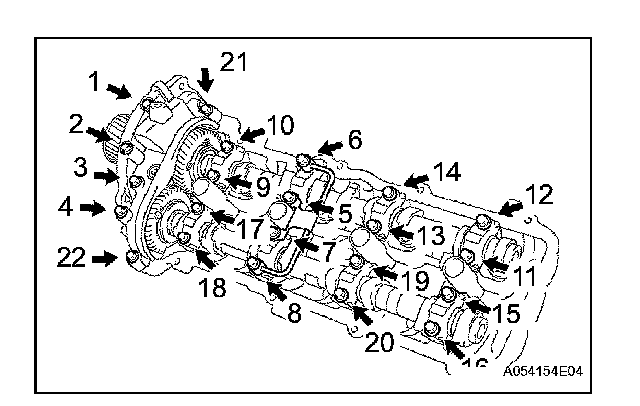 Uniformly tighten the 22 bearing cap bolts in several steps, in the order shown in the illustration.