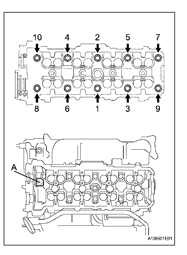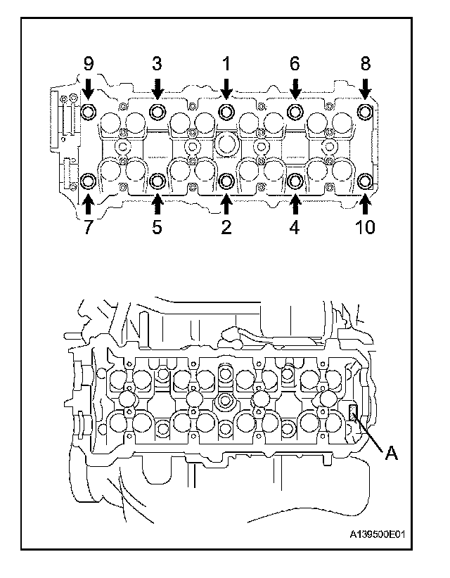 Install and uniformly tighten the 12 cylinder head bolts, and plate washers, in the order shown in the illustration.