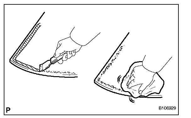 a. Using a scraper, remove the adhesive tape and adhesive sticking to the back window glass.