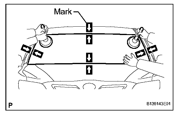d. Place matchmarks on the windshield glass and vehicle body on the locations indicated in the illustration.