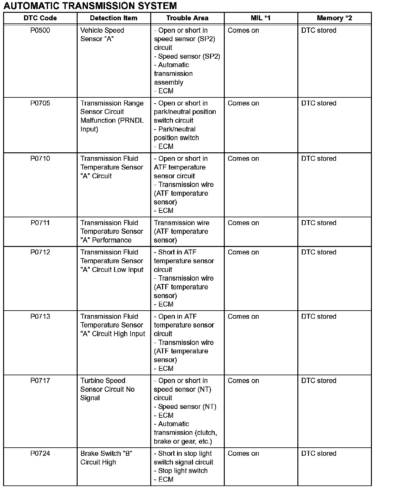 AUTOMATIC TRANSMISSION SYSTEMP0500-P0724: