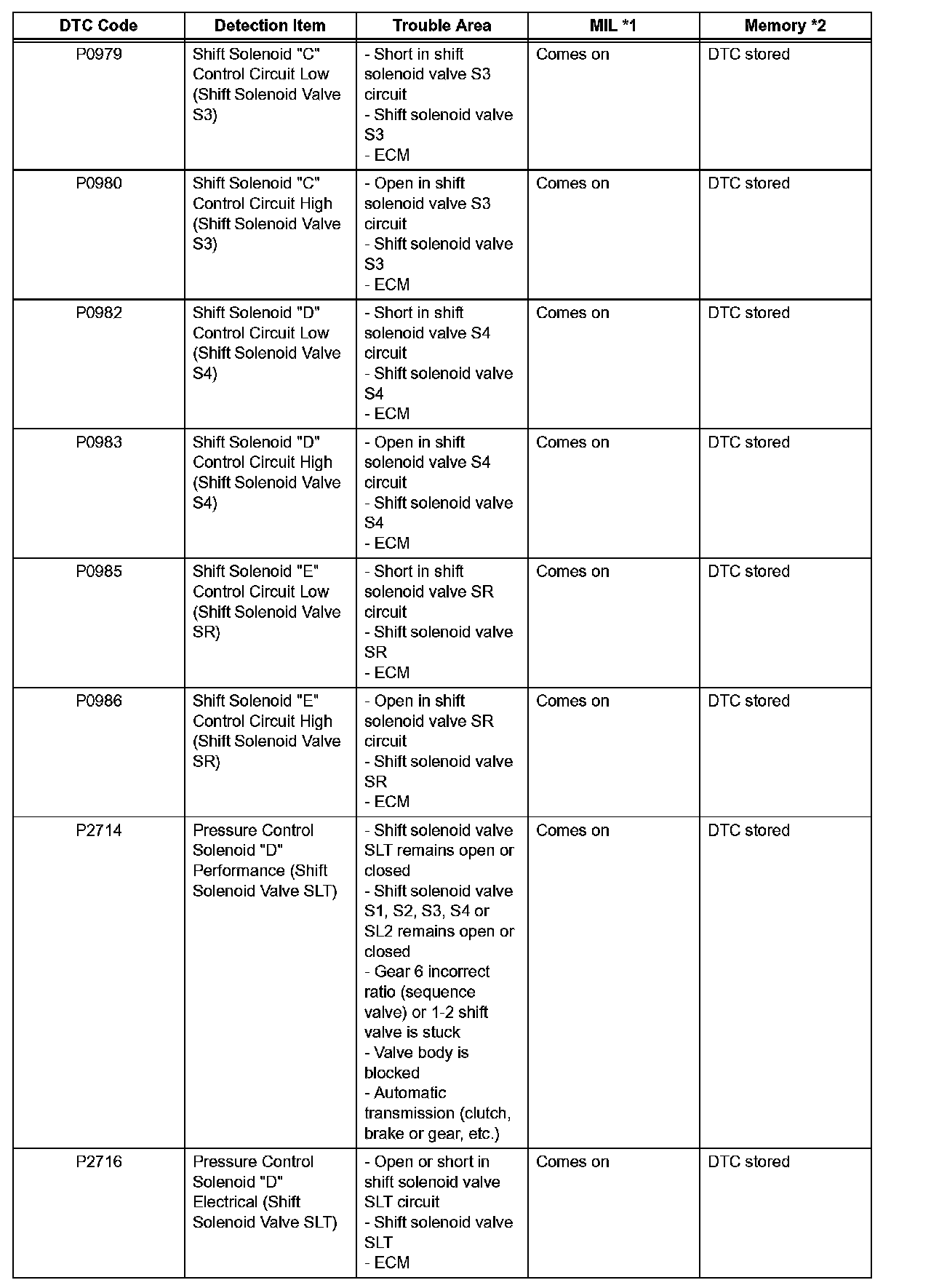 *2: "DTC stored" mark means ECM memorizes the malfunction code if the ECM detects the DTC detection condition.