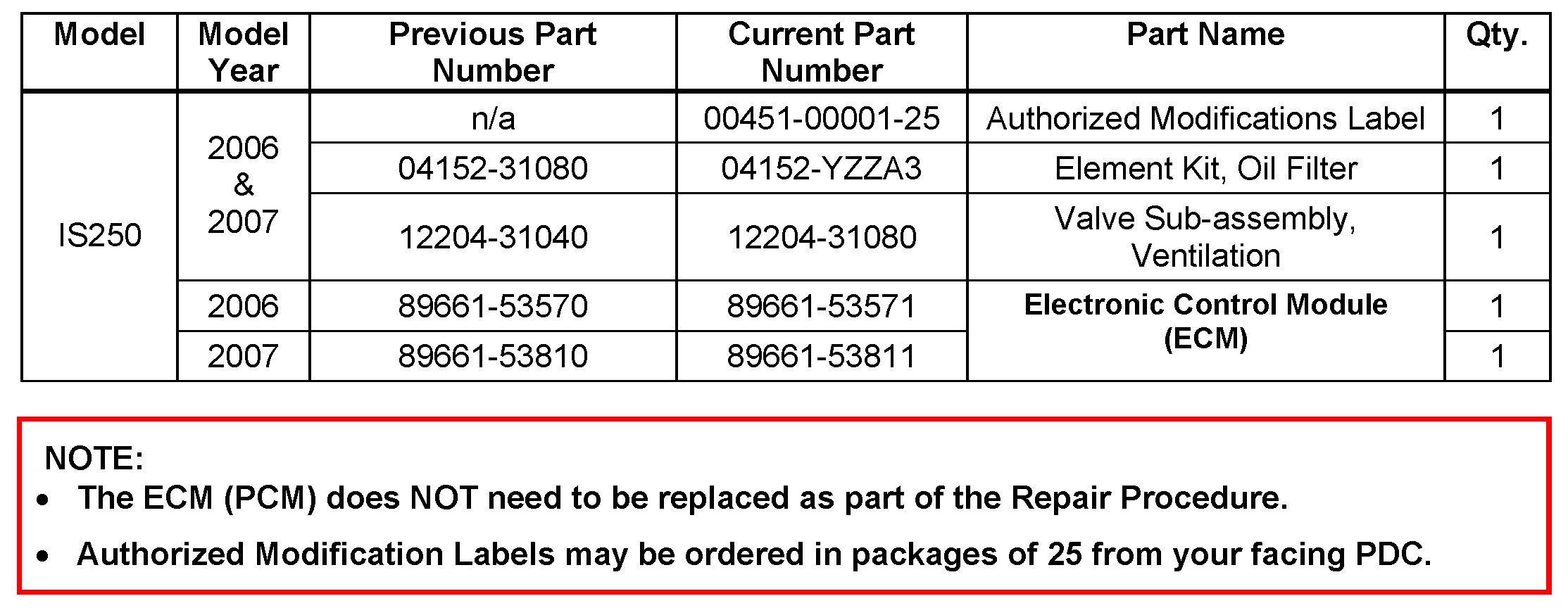- 2006 - 2007 model year IS 250 vehicles equipped with the 4GR-FSE engine and manual transmission, and produced BEFORE the Production Change Effective VINs shown below.