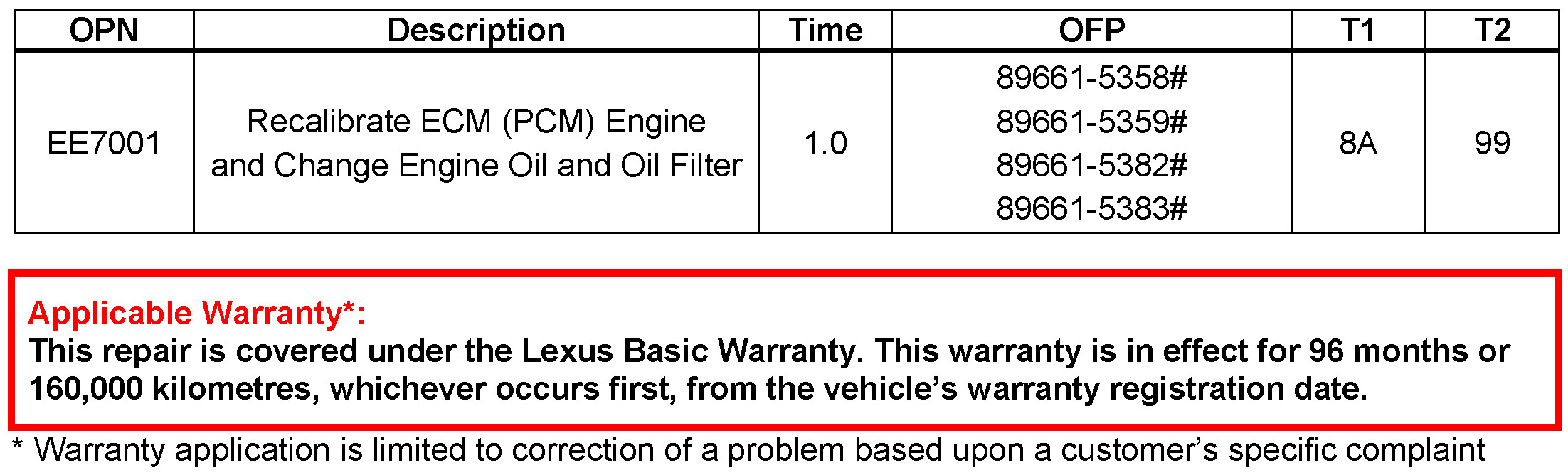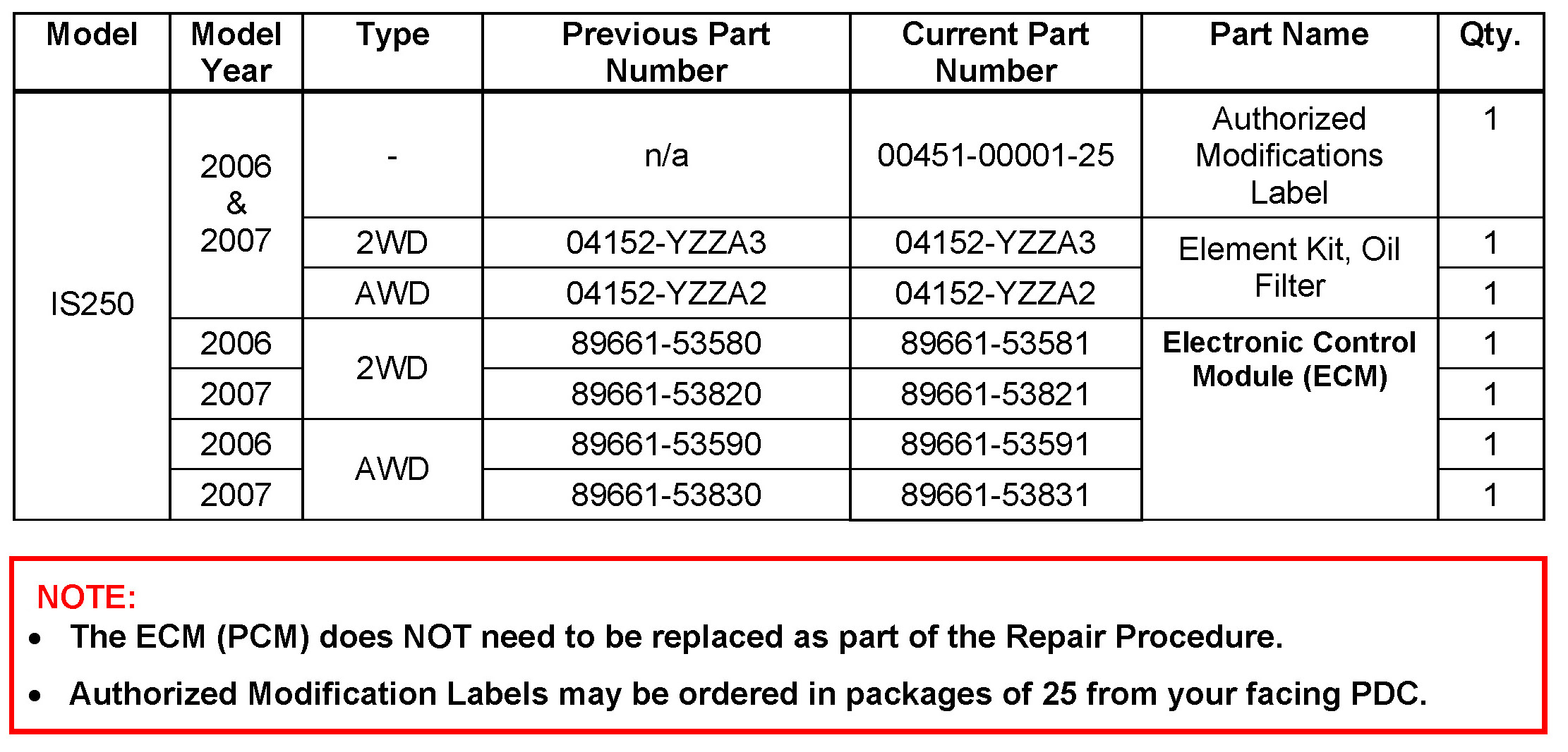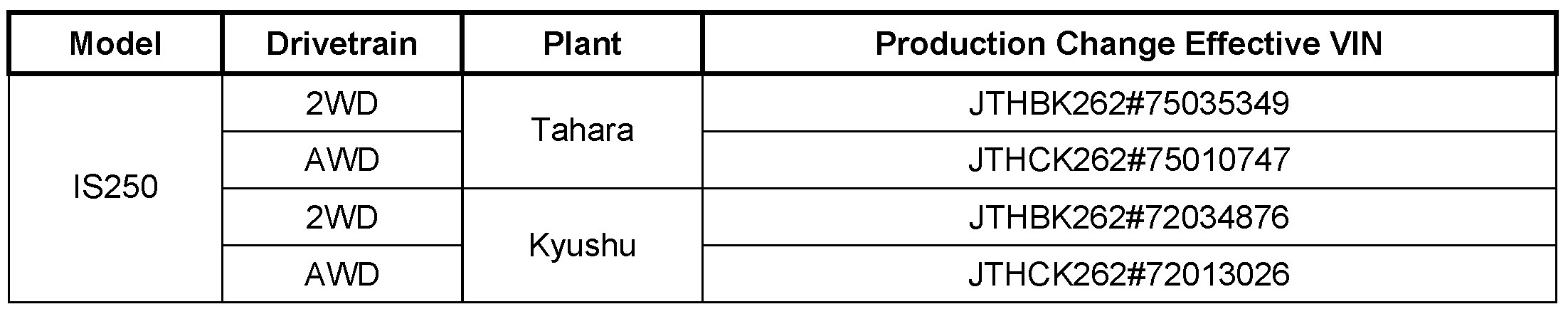 - 2006 - 2007 model year IS 250 vehicles equipped with the 4GR--FSE engine and automatic transmission, and produced BEFORE the Production Change Effective VINs shown below.