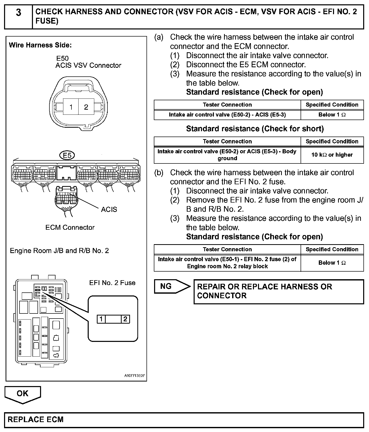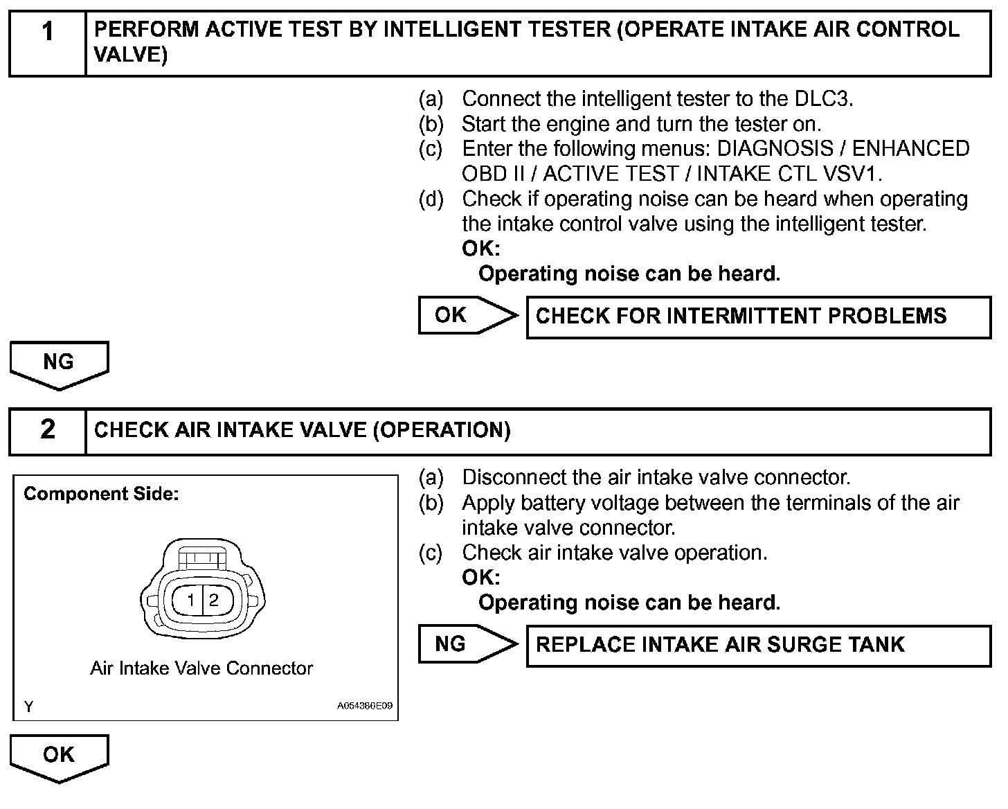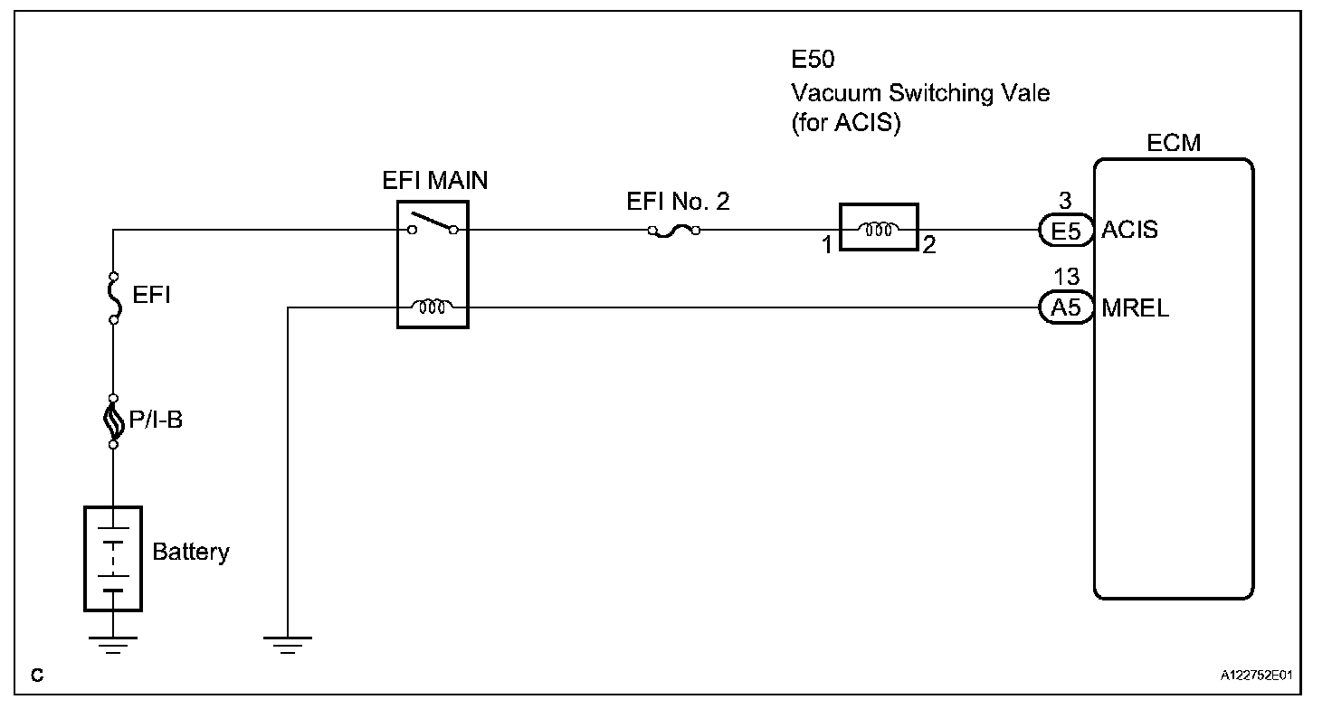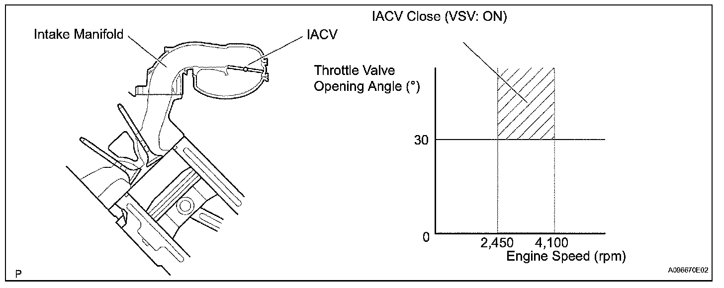 When the Intake Air Control Valve (IACV) opens and closes, the ACIS control circuit causes the engine load intake efficiency to increase. When the engine is running at 2,450 to 4,100 rpm and the throttle valve opening angle is 30° or more, current flows through the ACIS control circuit and the IACV closes. For all other situations, current does not flow through the ECM and the IACV is open.