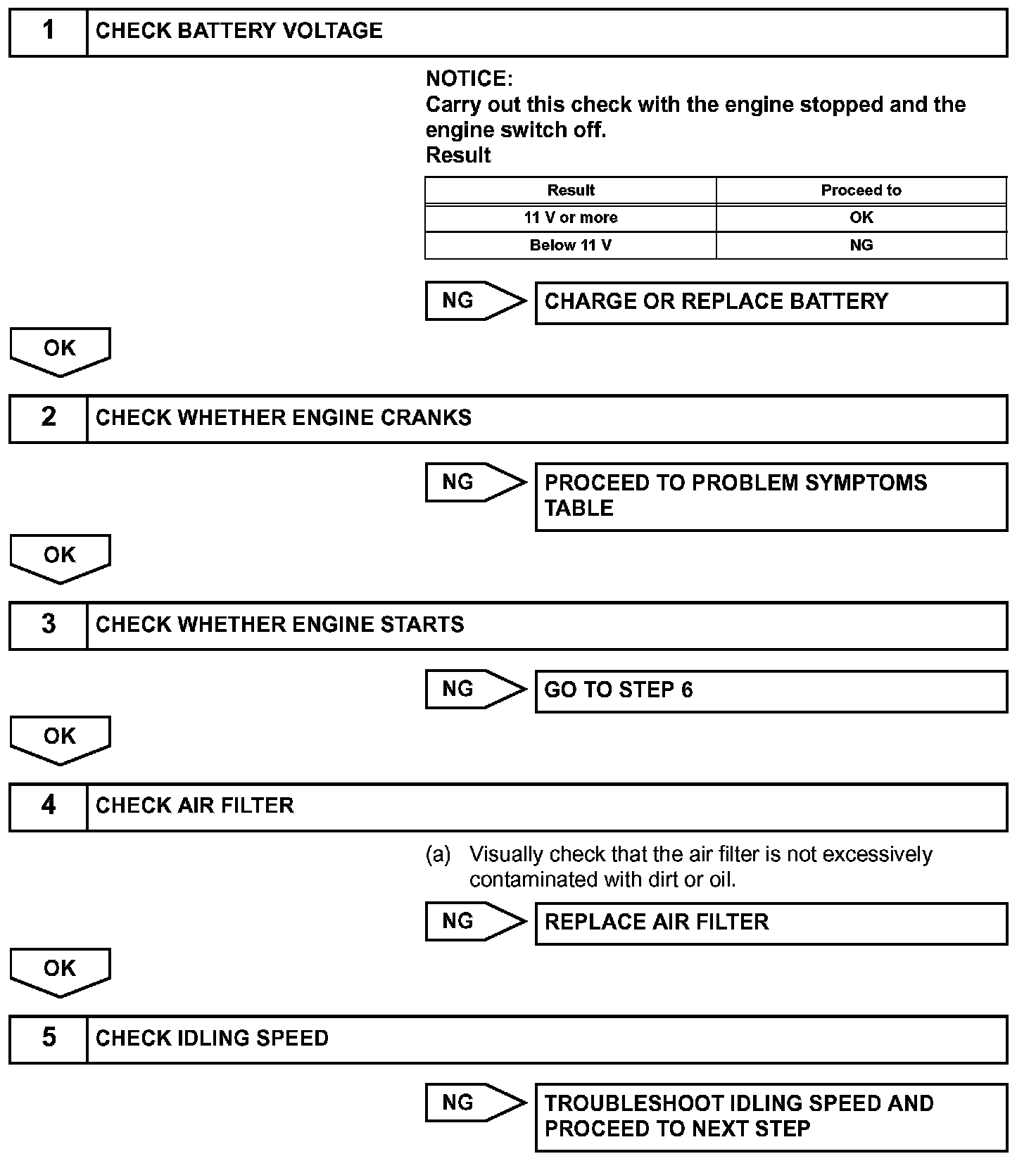 When the malfunction is not confirmed by the DTC check, troubleshooting should be carried out in all circuits considered to be possible causes of the problem. In many cases, by carrying out the basic engine check shown in the given flowchart, the location of the problem can be found quickly and efficiently. Therefore, using this check is essential when troubleshooting the engine.